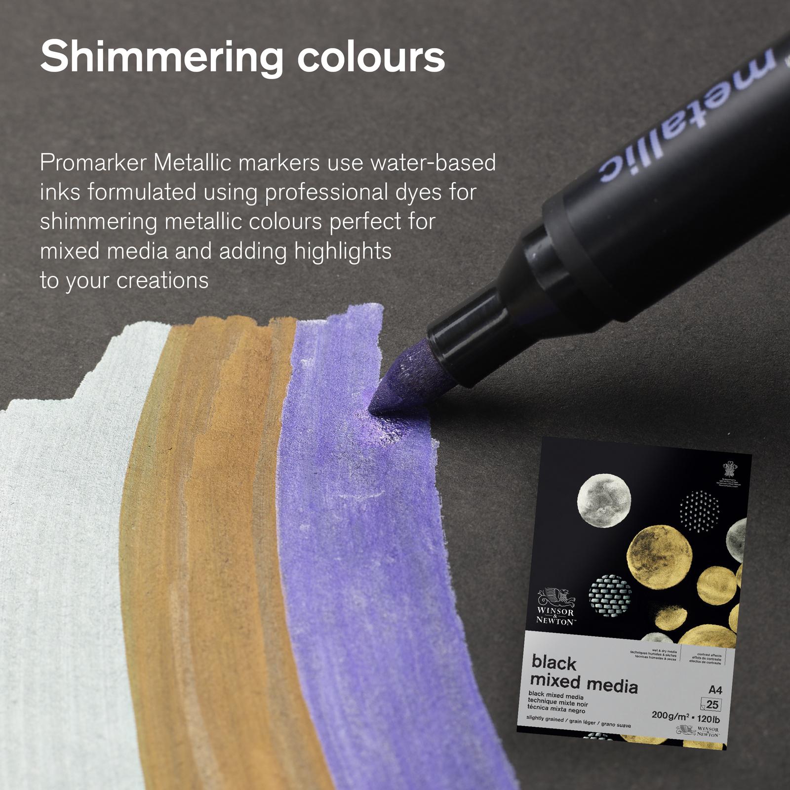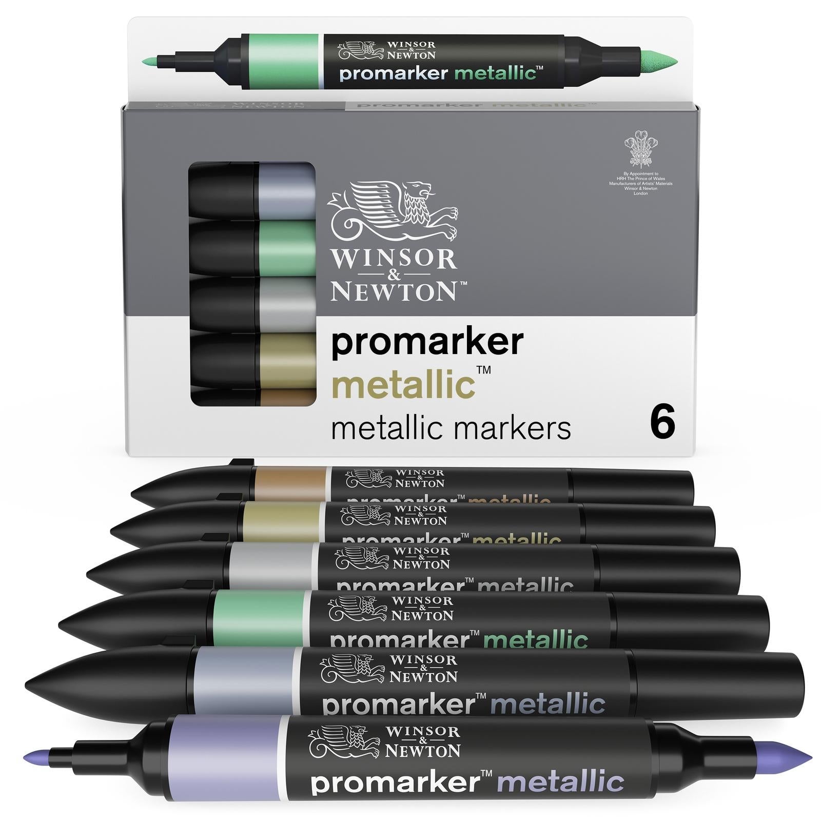 *Winsor & Newton Promarker Metallic Marker Set 6*Begin your MetallicMarker collection with this colour kit of Violet, Blue, Green, Silver, Gold and the shimmering Red Gold. Twin-tipped, they offer both medium and fine lines.The pigment-based ink used are lightfast enough to provide long-lasting results – even when blended with water.