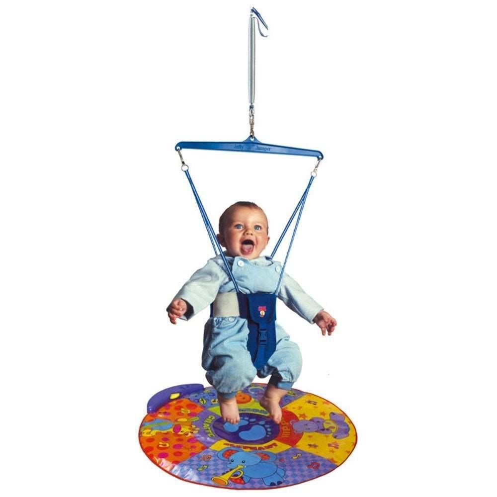 Jolly Jumper Musical Mat provides baby with lots of giggles while Jolly Jumping!Cushioned Musical Play Mat plays 3 fun music modes at baby's touch:* Dance* Jungle* Silly\*\*Mat requires 2 AA batteries (not included)