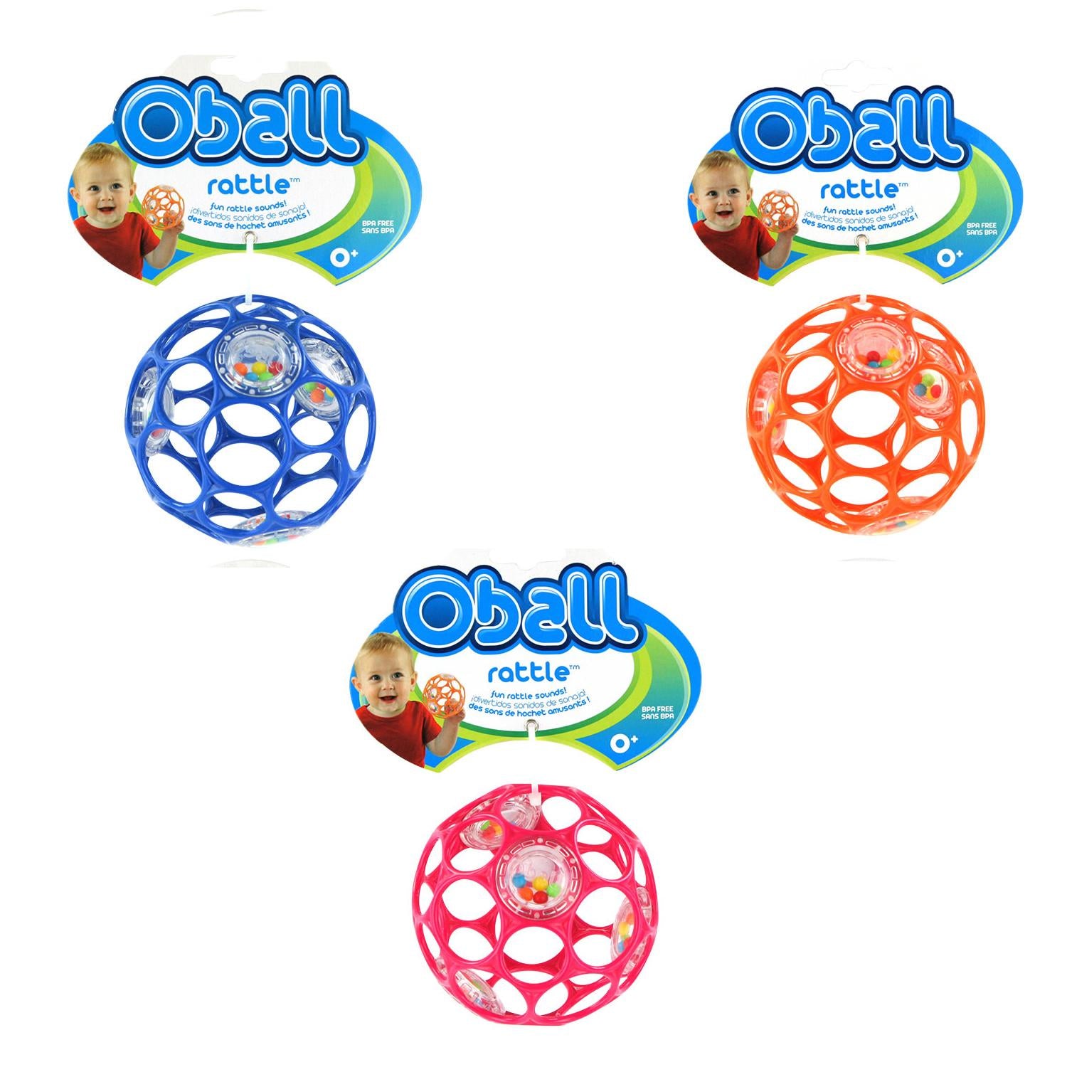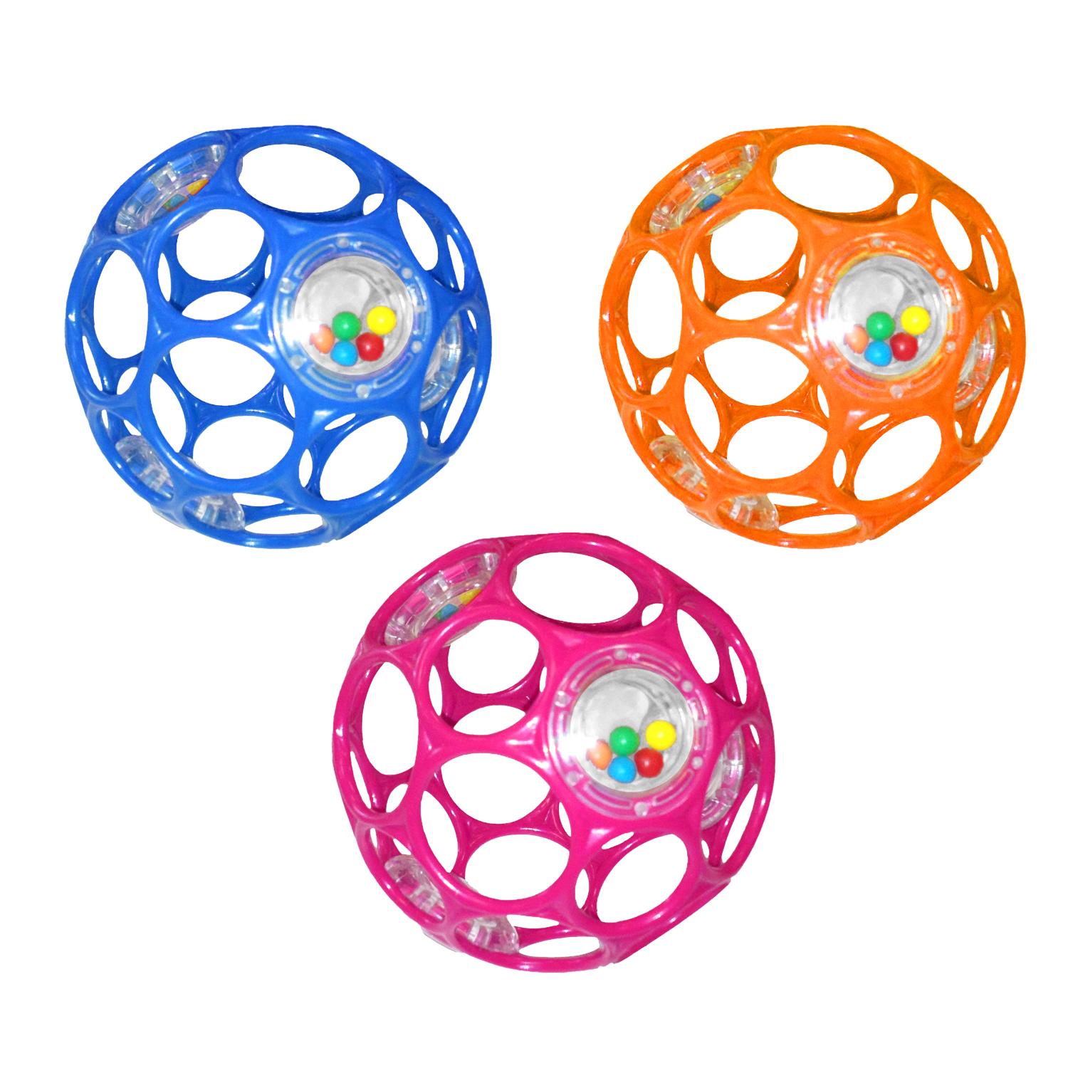 There’s a whole lot of shaking going on with the Oball Rattle™. Much more than your average baby rattle, this adorable rattle is easy to grasp and, it rolls!With 29 finger holes just right for little hands, this award-winning ball rattle is destined to be baby’s favorite. Embedded in the ball are three separate rattles filled with shaker beads that encourage baby to shake the ball and hear fun sounds.The flexible, patented design is easy on little fingers as baby tosses or rattles the ball. With four different color options, you'll want to have plenty of these 4-inch rattles on hand.Suitable for all ages.*Please Note:* This is an assortment. You will receive one Oball 4" Rattle and colours may vary.