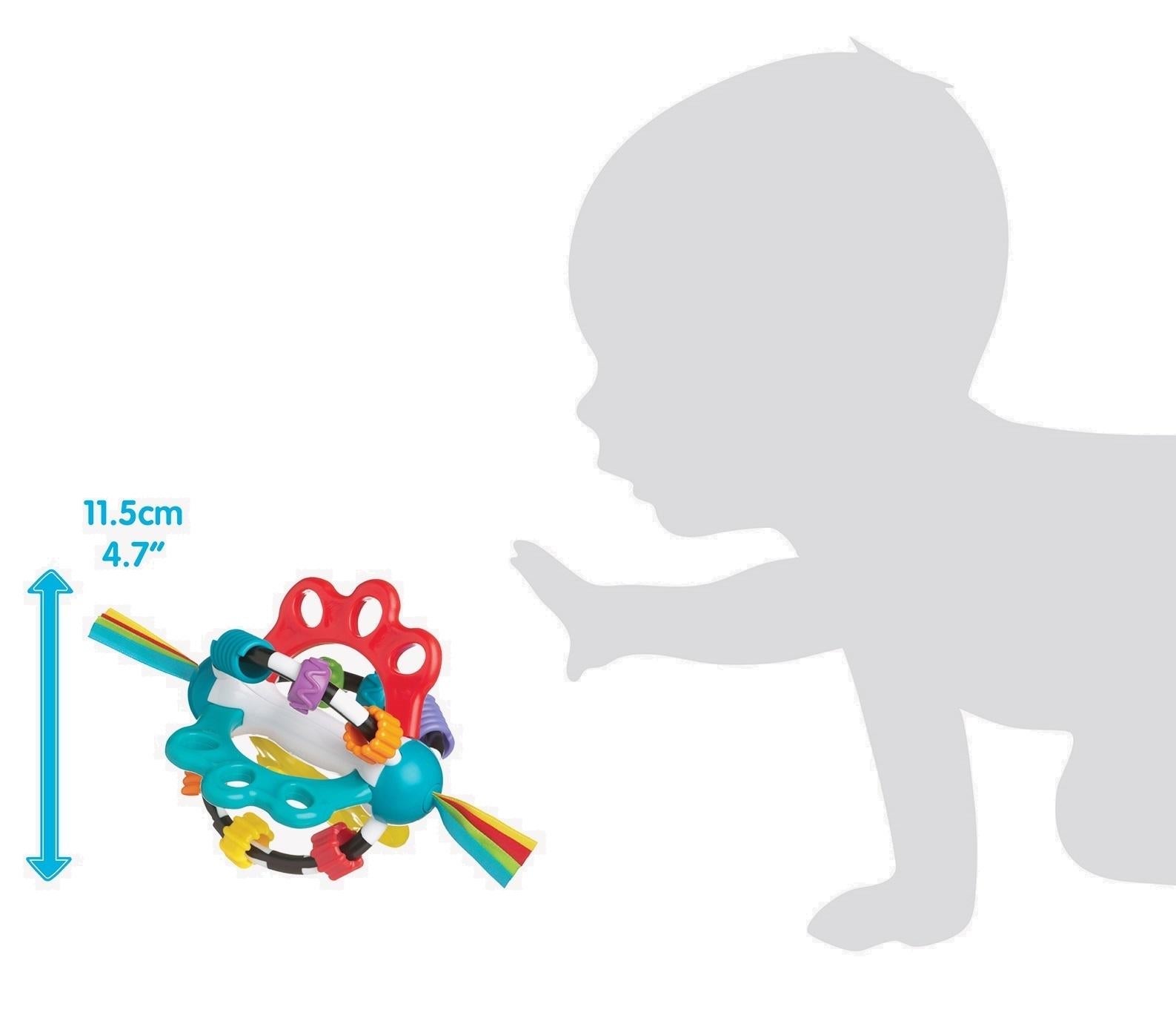 *Explore with me!*The Explor-a-ball provides a range of sensory experiences for baby all in one toy. Little fingers will enjoy exploring the variety of textures and surfaces as vibrant and contrasting colours stimulate visual perception. The colourful textured beads make a click-clack sound and are a safe teething aid for sore gums. Shaking and grasping the ball promotes gross motor skills while silky ribbons and moveable beads benefit baby’s fine motor skills.*Features:** As baby shakes and rolls Explor-a-Ball, rattling beads stimulate auditory system* Openings for fingers make it easy for baby to grip and hold* Various textures and materials for sensory exploration and teething* Colourful ribbons for practising fine motor skills* Contrasting colours promotes visual perception*Suitable for ages 6m & up*