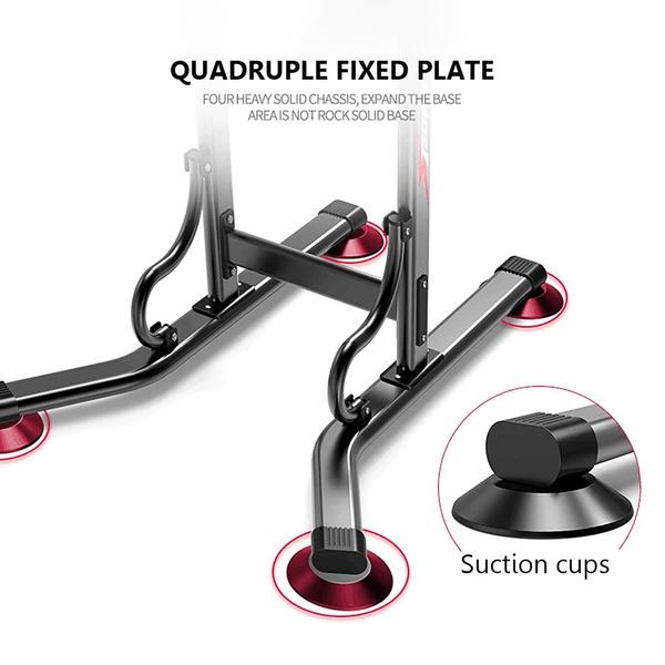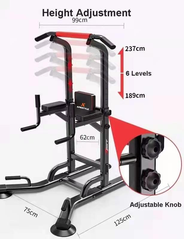Master your pull up game with the *Ape Style Multi-Function Pull Up Power Tower Home Gym!*Command a strong and stable frame to target key muscle groups throughout your body with everything from dips to leg raises and of course chin ups and pull ups!*Features:** Sturdy & stable construction – Heavy duty steel frame, multiple stable anti-skid cross bar and advanced curved shaped frame base design with 4 powerful suction caps to prevent any wobble* Comfortable & durable – Luxurious appearance and reinforced steel construction of this pull up dip station are going to last for years to come. Thicker back pad, the foam armrest and anti-skid elbow pads can reduce pressure and avoid the injuries* Multi-functional – Give you full body exercises like Pull-ups, Dips, Chin-ups, Push-up, Knee raise and others* 6 levels height adjustment, suit for anyone in the family* Non-slip and comfortable handles with rubber grids and armrests..* Suitable to use at home, office, gym or fitness room* Quick and easy to assemble*Specifications:** Material: Steel + PU* Overall assembled size: 99(L) x 125(W) x (189 – 237cm)H* Bottom frame material: Elliptical steel tube* Bottom frame size: 30mm x 60mm x 1.5mm (T)* Product weight (Approx.): 21Kg* Max weight capacity: 150Kg* Colour: Black*Package Content:** 1 x Pull Up Power Tower* 1 x User Manual