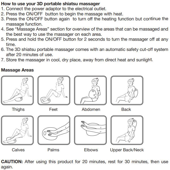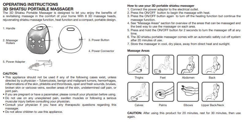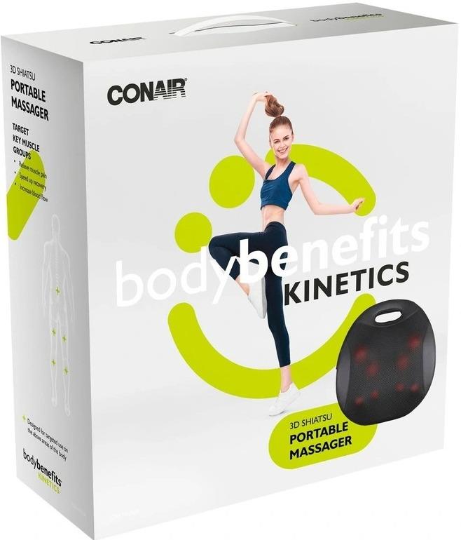 *_Conair: Body Benefits Kinetics 3D Shiatsu Portable Massager – Black_*The 3D Shiatsu Portable Massager is designed to let you enjoy the benefits of a rejuvenating massage in the comfort of your home or while you are traveling. With 8 3D massage heads, 2 massage settings, heat function and a compact, portable design, you can personalise your massage experience wherever you are!*Features:** Eight Rolling Massage Heads for deep kneading to relive tension in tight muscles* Dual Direction With 2 massage Modes that change every 1 minute between Shiatsu and Rolling massage* 3D Massage Technology allows massage heads to target deeper muscle tissue* Heating Function for stimulating blood circulation* 20MIN Auto Shut Off for safety and signals the completion of a recommended session time