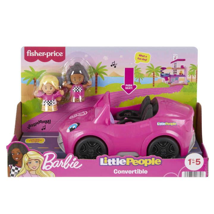 *Fisher Price: Little People – Barbie Convertible Toy Car*The classic Barbie® convertible is brought down to Little People® toy size for toddler-friendly pretend play with this adorable vehicle and figure set from Fisher-Price®. When kids press one of the Little People® figures into the car's driver's seat, they'll hear fun songs, sounds and phrases. Sized just right for little hands, this push-along toy convertible seats both figures and features cool Barbie® colours and graphics.*Features:** The iconic Barbie® convertible sized down for toddler-friendly pretend play!* Press the driver's seat for cool songs, sounds and phrases* Comes with 2 Little People® figures styled in Barbie® colours* Push-along sports car and figures sized just right for small hands to grasp and move, helping to strengthen fine motor skills* For toddlers and preschool kids ages 18 months to 5 years* Ages 1 1/2 – 5 years