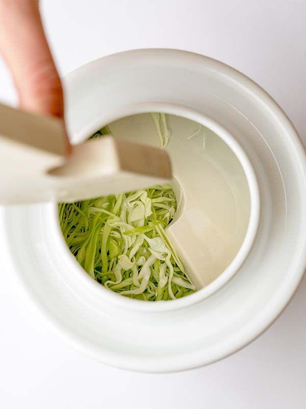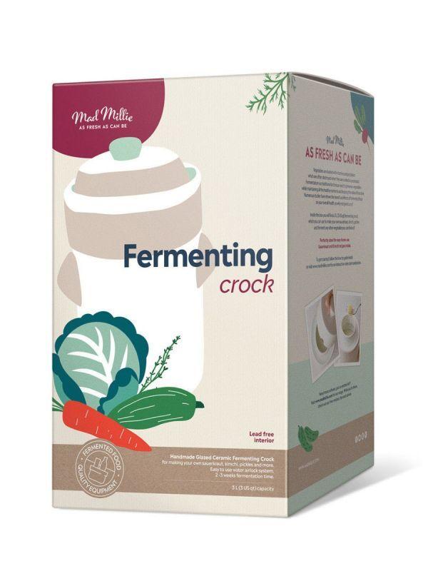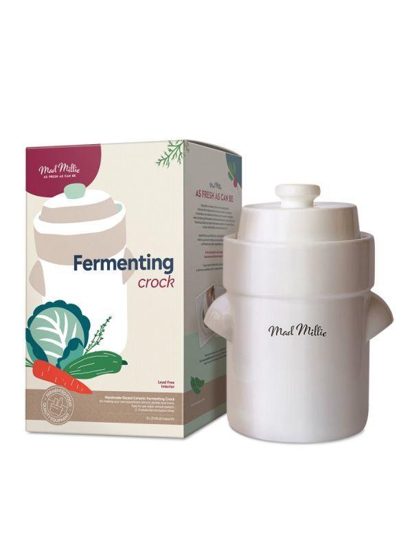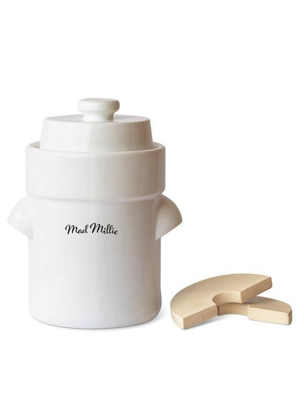 Numerous studies have shown the beneficial health effects of fermented food, especially fermented vegetables such as sauerkraut or kimchi. Fermenting vegetables is a tasty way to preserve while locking in all the healthy enzymes and probiotics.The 3L Sauerkraut Crock fits up to two medium sized cabbages and makes two 1L jars full of sauerkraut or kimchi which lasts up to three months when stored in the fridge.*Kit Contains:** 3L Mad Millie Handmade Ceramic Sauerkraut Crock* 2 Traditional clay weights* Instructions and recipes
