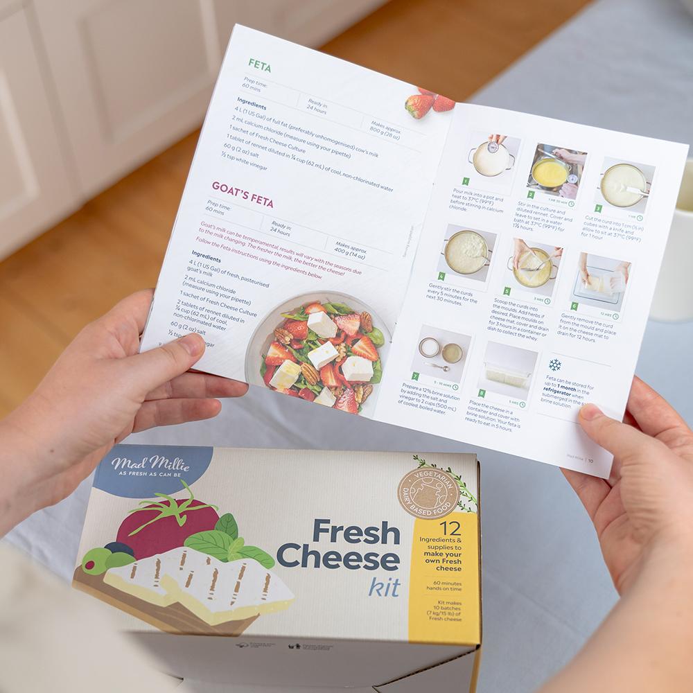 The Fresh Cheese Kit provides you with everything you need to make an array of fresh artisan cheese at home. Just add fresh milk!This kit is ideal for beginners and makes up to 7kg (15lbs) of fresh cheese. All consumables can be purchased seperately once used. For best results, use this kit with the Mad Millie Cheesemaker (under equipment on online store).Makes:* Feta- approx 800g/batch,* Halloumi- approx 600g/batch,* Cream cheese- approx 400g/batch,* Cottage Cheese- approx 300g/batch,* Quark- approx 300g/batchKit Includes: Cheese Coth, Cheese Salt, Square Feta Moulds (2), Steriliser, Mesophillic Starter Culture (MW3), Vegetarian Rennet Tablets (10), Stainless Steel Thermometer, Cheese Mat, Calcium Chloride, Pipette, Culture and Enzyme Measuring Spoons.The mesophilic culture is shelf stable for 8 months at temperatures under 25 degrees celcius. However, we suggest storing cultures in the freezer when you get them in order to prolong the life of the culture.All consumables can be purchased seperately once used.*Note: The culture in this kit contains a very small amount of dairy*