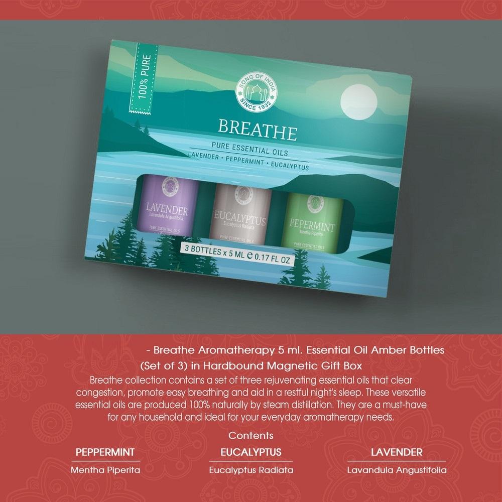 Pack of 5 ml bottles – Breathe collection contains a set of three rejuvenating essential oils that clear congestion, promote easy breathing and aid in a restful night's sleep.These versatile essential oils are products 100% natural by steam distillation,