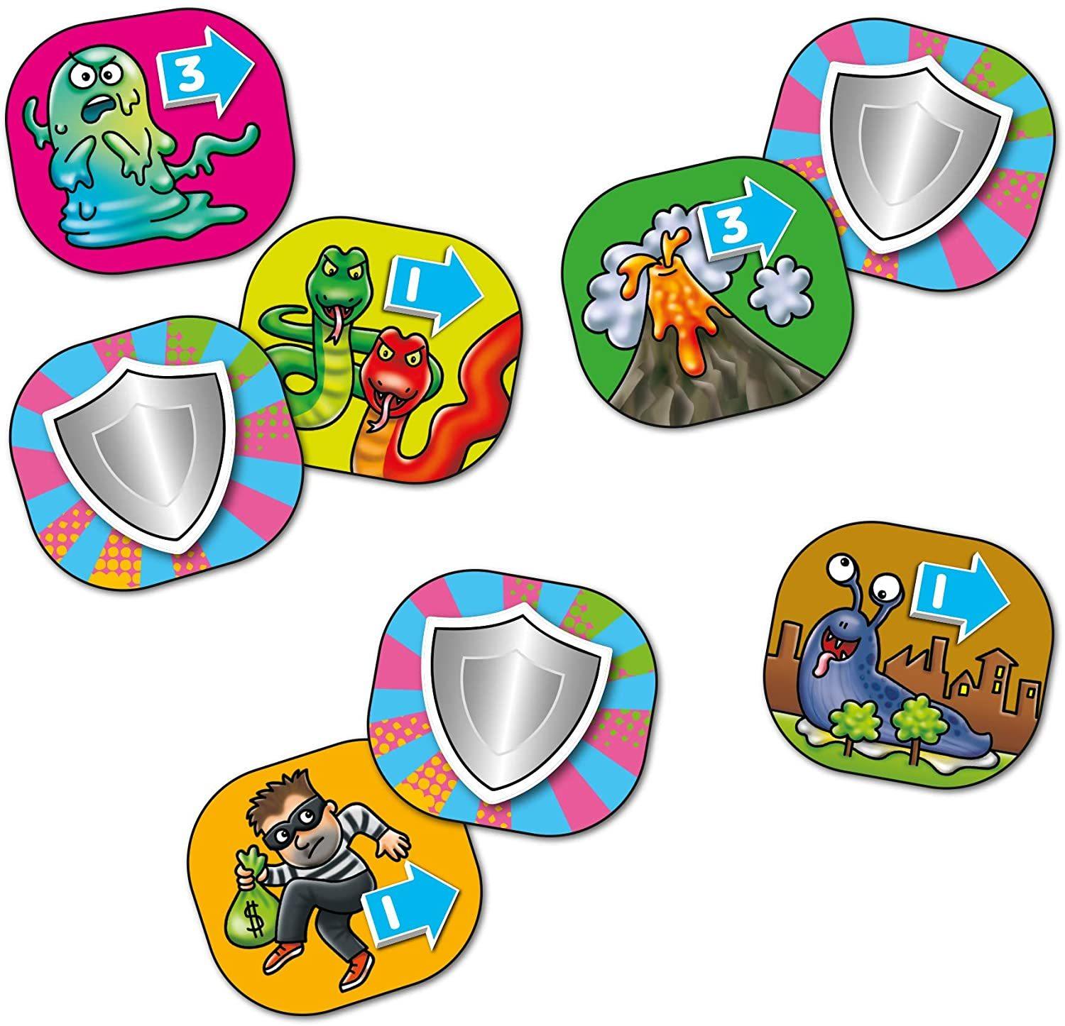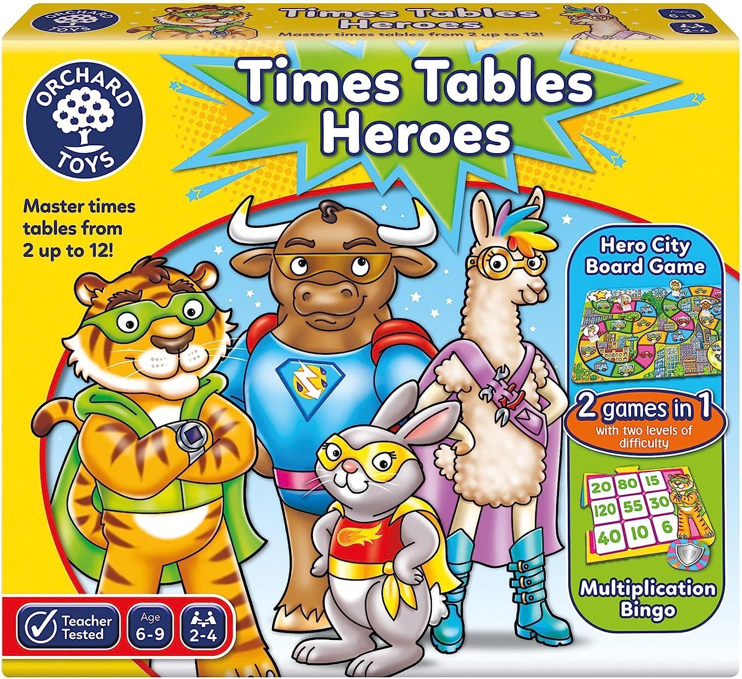 *This fun multiplication game will help children practise their times tables from 2–12. With two games in one – Hero City board game and Multiplication Bingo – times table practise will be filled with fun!*In the Hero City Board Game players move around the board by spinning the spinners and solving multiplication sums. If a player lands on a shield square they have to use their imaginations to help their superhero defeat the disaster – they'll need to defeat the evil unicorns, outwit the zombies or even escape the giant slugs! Times Tables Heroes also includes a colourful times tables checker, which can be used with or outside of the game to extend learning.*Game Contents:** 1 jigged double-sided board* 21 shield cards* 4 character playing pieces* 4 character stands* 3 spinner boards* 3 two-part plastic spinners* 1 times tables checker* 4 superhero reference cards* 1 instruction leaflet*Suitable for ages 6 & up*