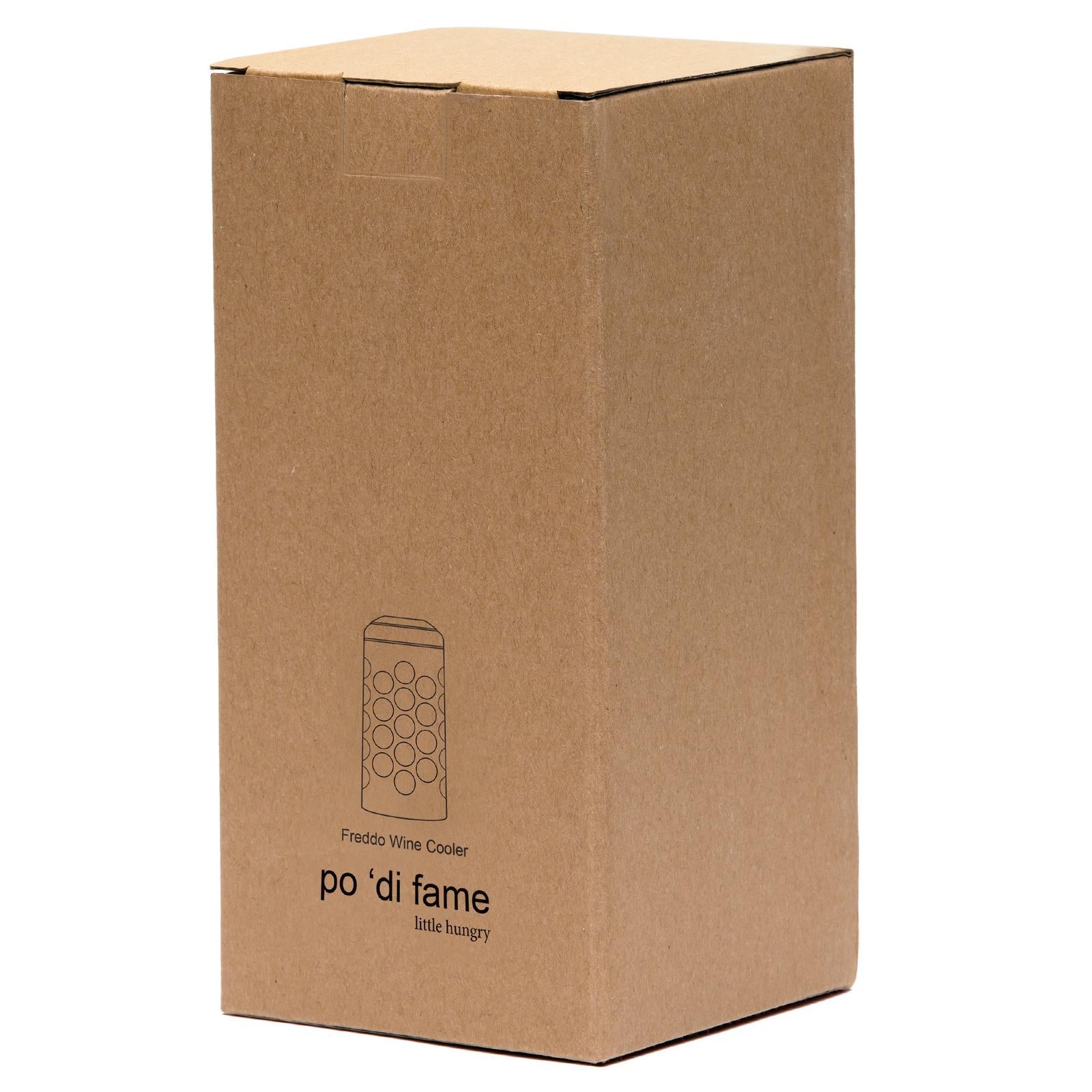 *Po di Fame: Freddo – Wine Cooler**Features:** Vacuum insulated* Bespoke dimple pattern* Keeps wine cool for up to 6 hours* Twist on lid with silicone sleeve, fits most 750ml wine and champagne bottles* Pour without removing bottle from cooler* po ‘di fame laser engraved logo on silicone base* Supplied: in a po ‘di fame kraft presentation box (11.5cm W x 24cm H x 12cm D)*Specifics:** *Brand* – Po di Fame* *Material* – Powder coated Double walled Stainless steel 304# grade (18/8)* *Dimensions* – 22.5cm H x 11cm Dia.* *Colour* – Matt black