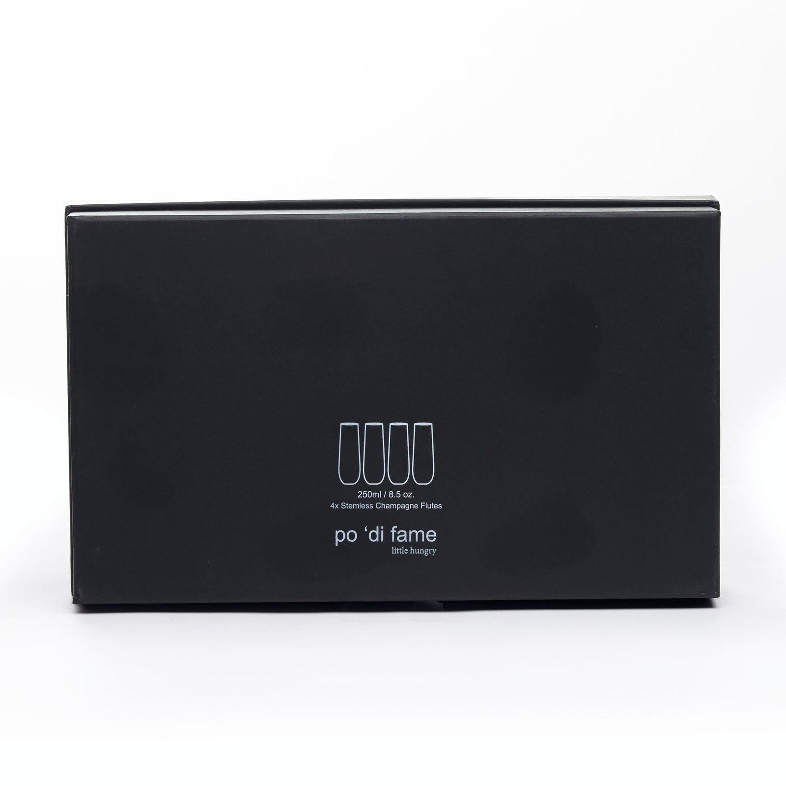 *Po di Fame: Stemless Champagne Flutes – Glass Set**Features:** 4 x Stemless glass champagne flutes* Supplied: in a black po ‘di fame two part presentation box (34cm W x 7.5cm H x 21cm D)*Specifics:** *Brand* – Po di Fame* *Material* – Glass* *Dimensions* – Glasses: 16cm H x 4.8cm Dia. (top)* *Capacity* – 250ml