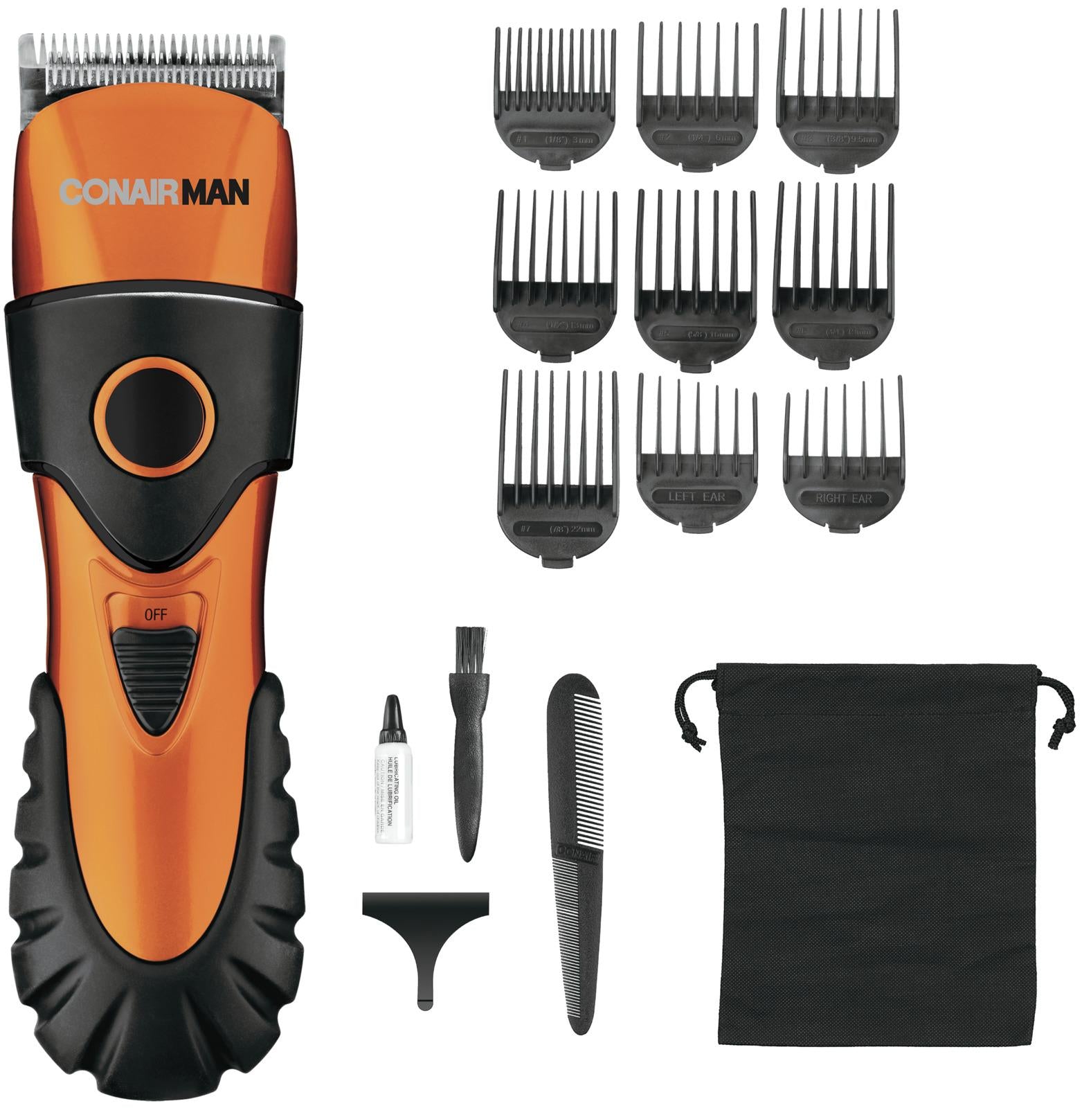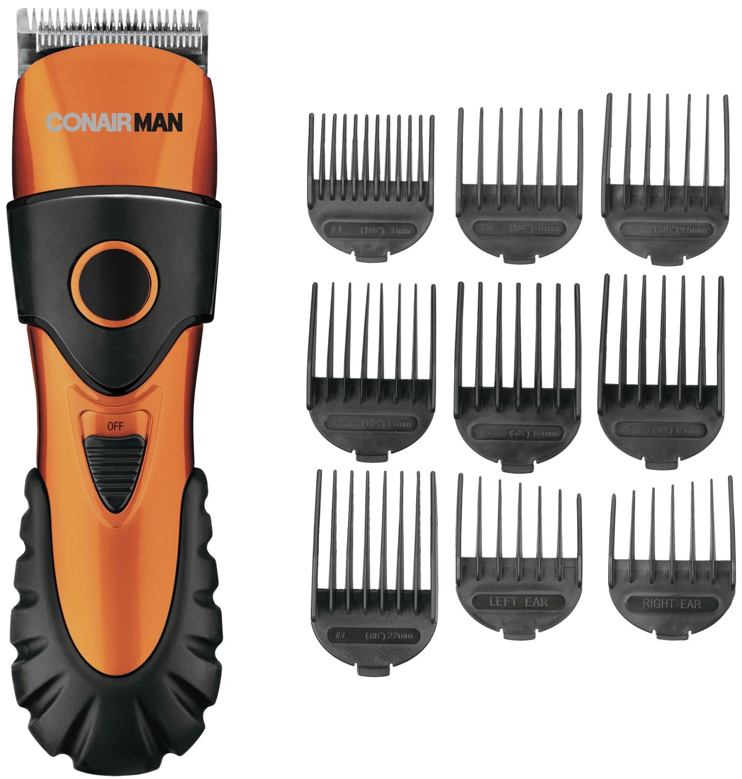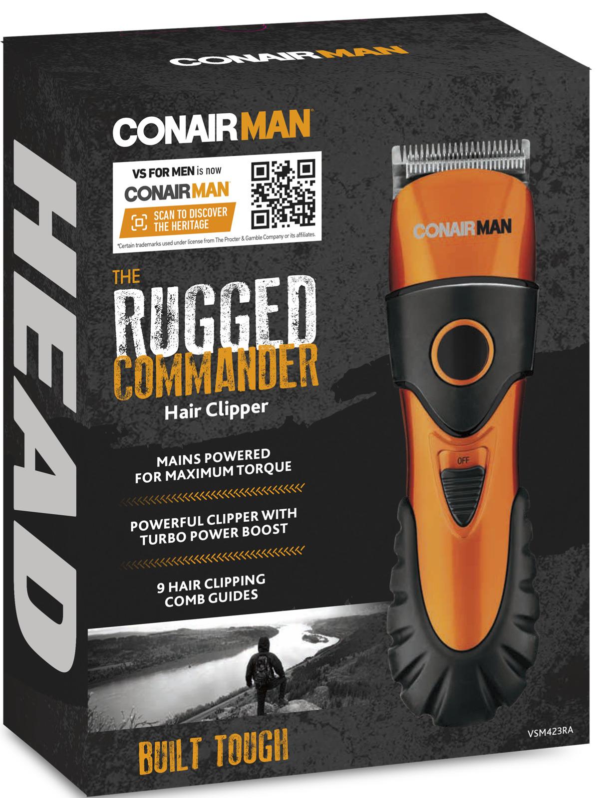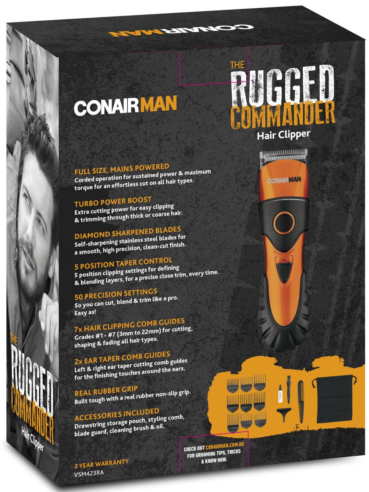 *_ConairMan: Rugged Commander Head Clipper with Turbo Power Boost_*POWERFUL CLIPPER WITH TURBO POWER BOOST*Features:** Corded operation for sustained power & maximum torque for an effortless cut on all hair types* Extra cutting power for easy clipping & trimming through thick or coarse hair* Self-sharpening stainless steel blades for a smooth, high precision, clean-cut finish* 5 position clipping settings for defining & blending layers, for a precise close trim, everytime* 50 precision settings So you can cut, blend & trim like a pro* 7 hair clipping comb guides – Grades #1 – #7 (3mm to 22mm) for cutting, shaping & fading all hair types* Built tough with a real rubber non-slip grip* Accessories; Drawstring storage pouch, styling comb, blade guard, cleaning brush & oil
