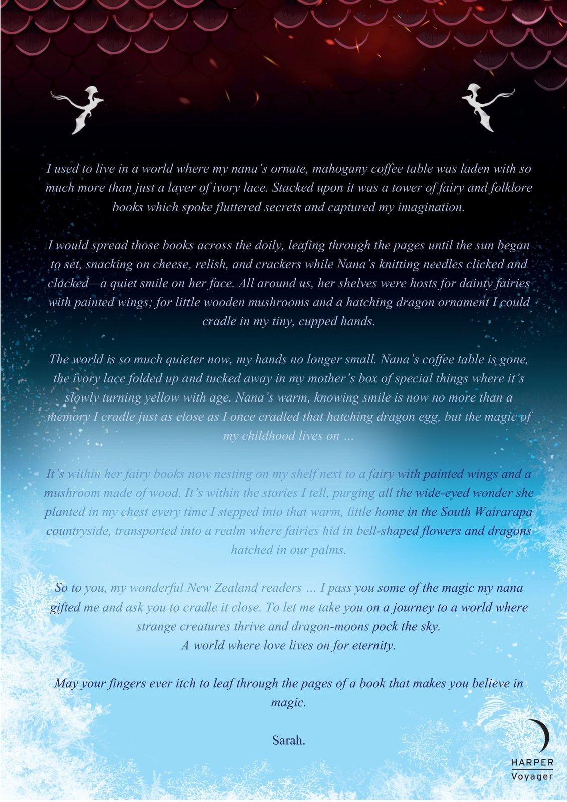 The Creators did not expect their beloved dragons to sail skyward upon their end. To curl into balls just beyond gravity’s grip, littering the sky with tombstones. With moons. They certainly did not expect them to fall.As a valued Elding Blade of the rebellion group Fíur du Ath, Raeve’s job is to kill. To complete orders and never get caught.When a renowned bounty hunter is employed by The Crown to capture a member of the Ath, Raeve’s world is turned upside down. Blood spills, hearts break, and Raeve finds herself at the mercy of the Guild of Nobles—a group of dual-beaded elementals who intend to turn her into a political statement.Only death will set her free.*Author Biography*Sarah A. Parker is an international bestselling author who grew up on a farm in New Zealand, where she spent her days getting lost amongst the rolling pasture, building forts in the hedge, climbing trees, and exploring the forest pathways - making up elaborate stories that never lost their grip on her. She now lives in Australia with her husband, dog, three children, and countless plants, and spends her days pouring her stories onto paper rather than throwing them to the wind. Her genre of choice is epic fantasy romance, and she thrives off dreaming up real, complex characters and immersive worlds to get lost amongst.