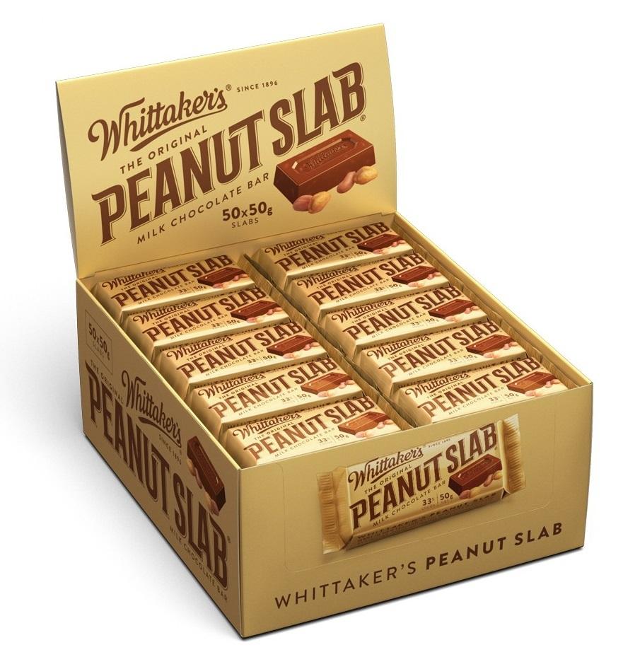 *Whittaker's Peanut Slab 50g 50pk*The original, the one, the only. Wonderfully roasted peanuts surrounded by our Creamy Milk chocolate. As kiwi as, well, as a Whittaker's Pe­anut Slab.*Ingredients:* _milk chocolate (sugar, cocoa solids 33%_ (cocoa mass and cocoa butter), milk powder 17%, emulsifier (soya lecithin); vanilla flavour) and roasted peanuts 35%. minimum percentage. may contain traces of tree nuts and gluten.\*