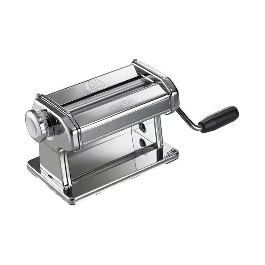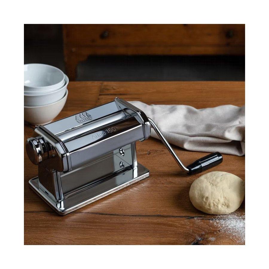 Choosing your new pasta machine is a special moment, so we have created different finishes that suit your style.*_Atlas Design in coloured aluminium_*We have chosen aluminium to guarantee a top quality, coloured product that is also safe in terms of hygiene. An important feature, which makes Atlas 150 the only fully anodized machine that can be used in contact with food.*_Atlas Classic in chrome steel_*The machine is made entirely of high quality chrome steel, processed and assembled in Italy. The smallest details of each part are designed to enhance its elegance, ensure product durability and simplicity. Atlas Classic has handle and clamp made of chrome steel and ABS.