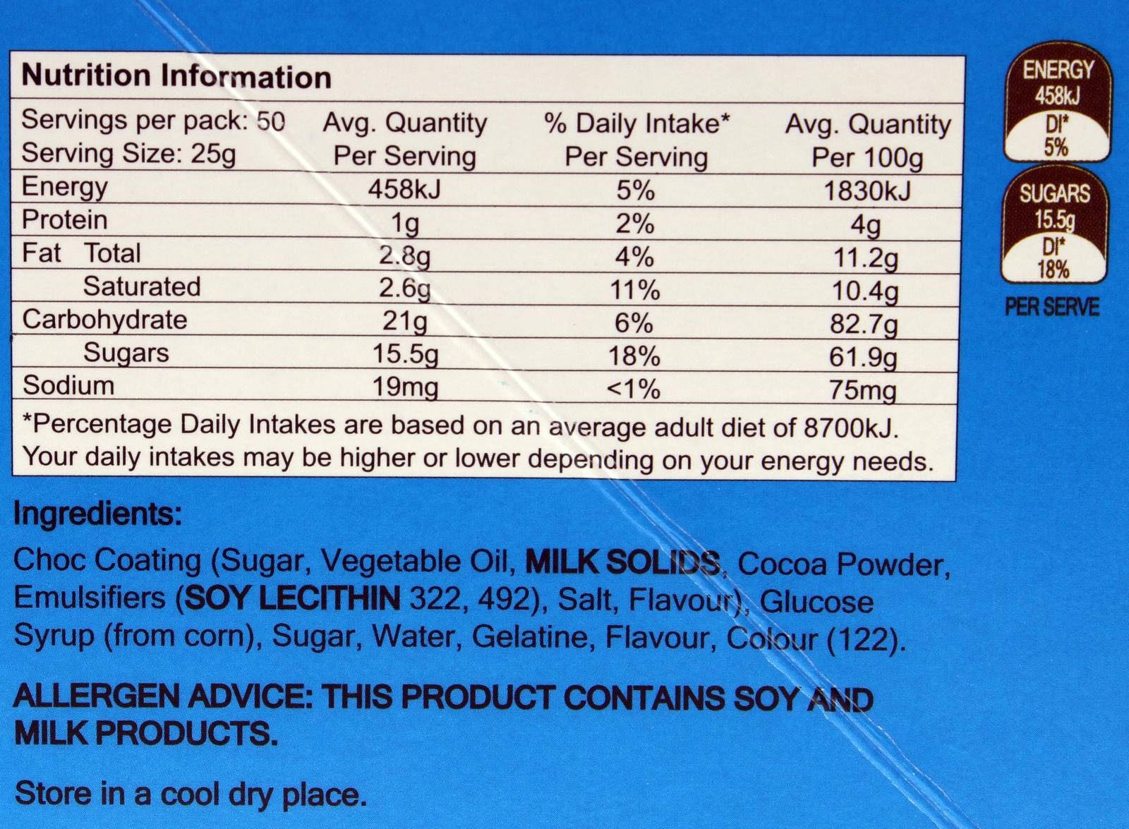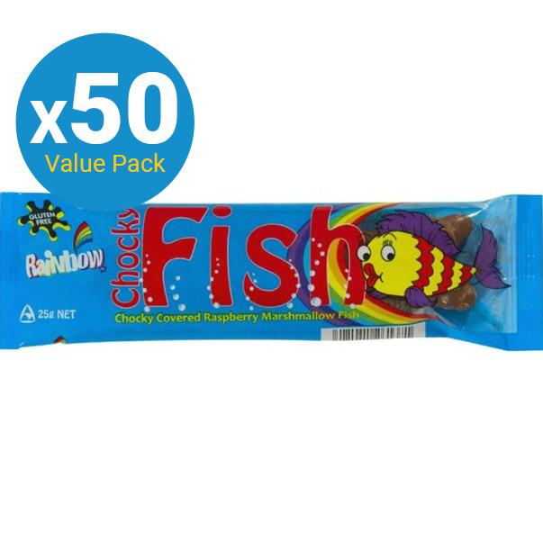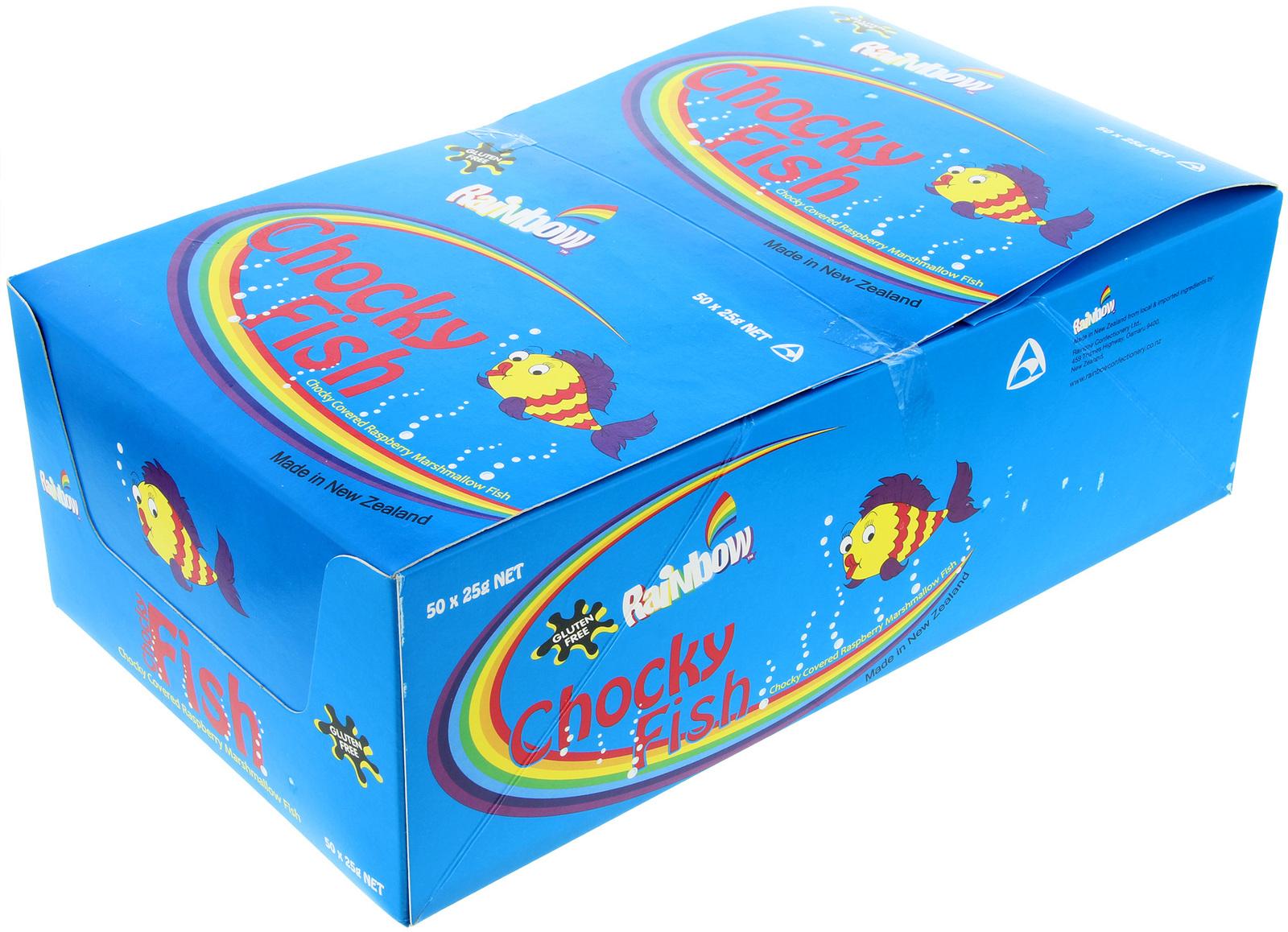 A New Zealand favourite! Bulk Box containing 50 raspberry flavoured marshmallow choc fish, coated in a smooth creamy Choc coating. Individually wrapped standard size 25g fish.Gluten Free._This is quality NZ made confectionery that tastes great, and is not old stock. Rainbow Confectionery is manufactured in Oamaru, New Zealand._Ingredients: Sugar, Glucose Syrup, Vegetable Oil, Water, SKIM MILK POWDER, Cocoa Powder, Gelatine, BUTTER OIL, Emulsifiers (SOYA LECITHIN, 476,492), Salt, Flavour, Colour (122).