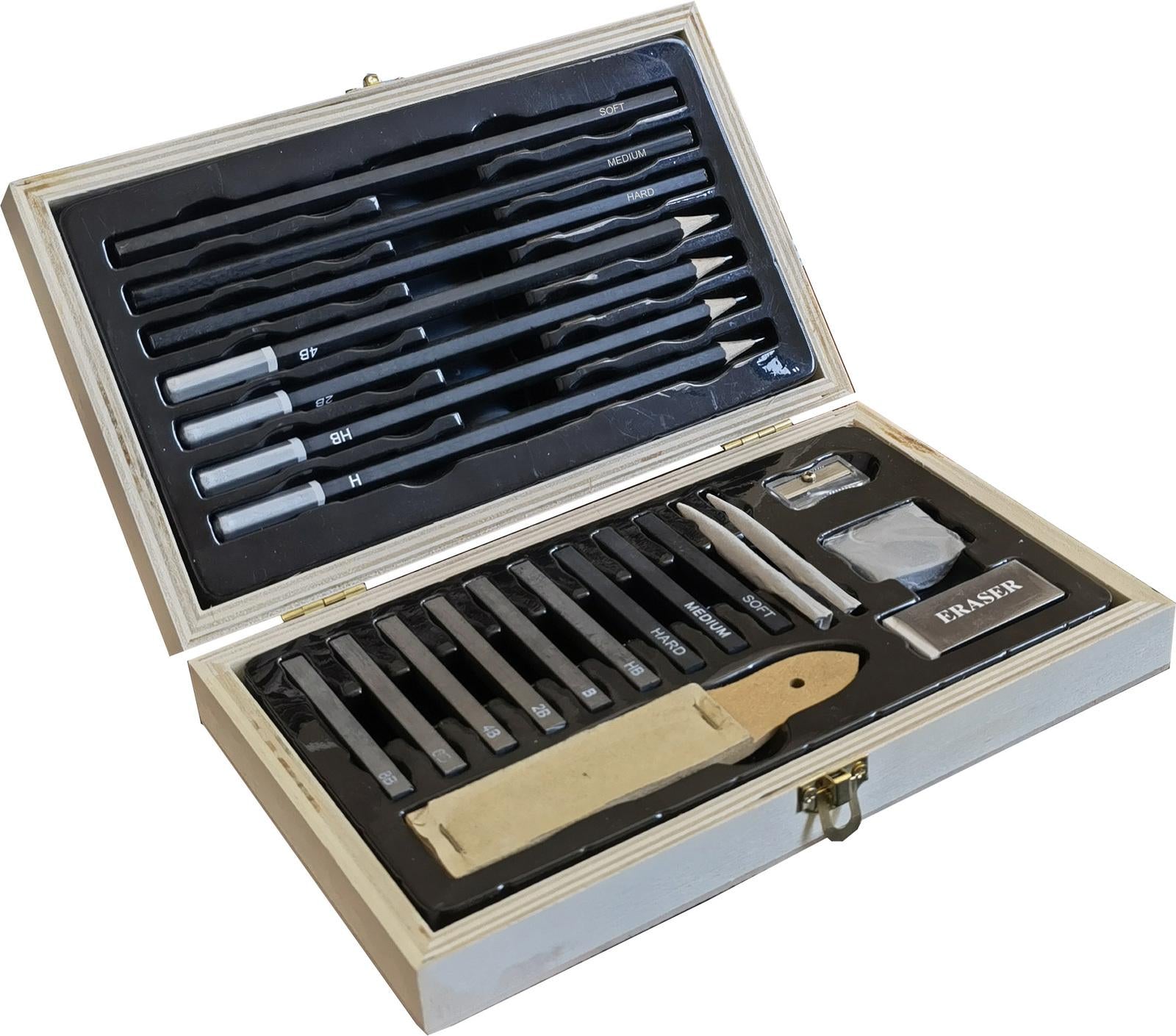 Jasart Mini Sketching Wooden Box Set includes 6 Pencils, 4 Sketching Pencils, 3 Charcoal Sticks, 3 Charcoal Pencils, 2 Blending Stumps, 1 Kneadable eraser, 1 white eraser, 1 sandpaper block, 1 pencil sharpener.*Features:** Jasart Drawing & Sketching Sets are ideal for hobbyists and students.* All in a convenient wooden box.* Collection of sketching pencils