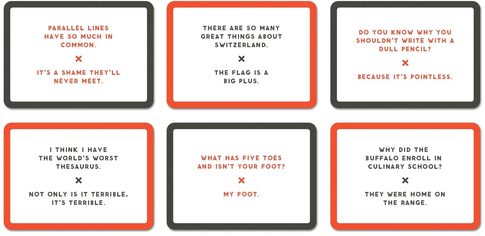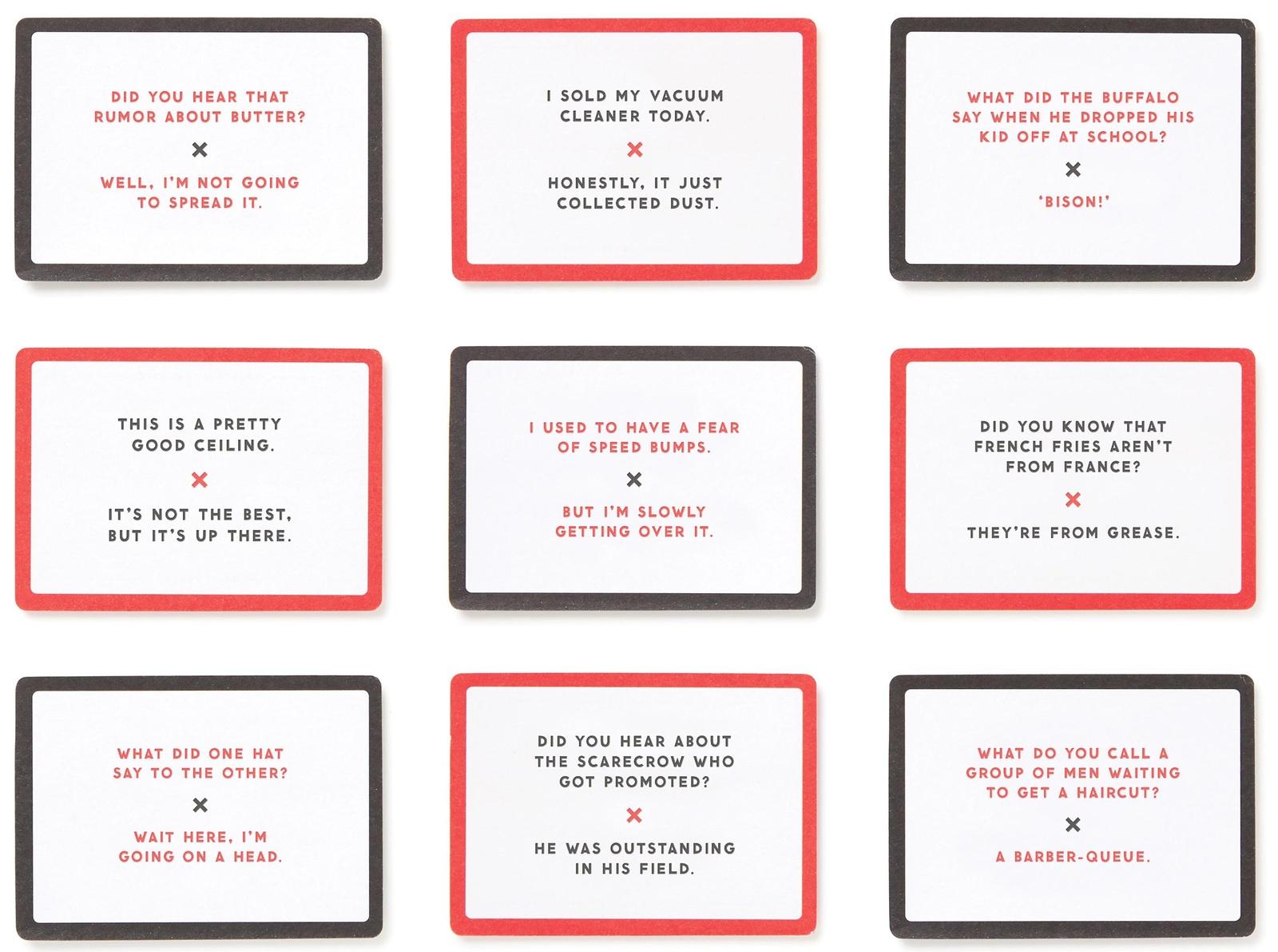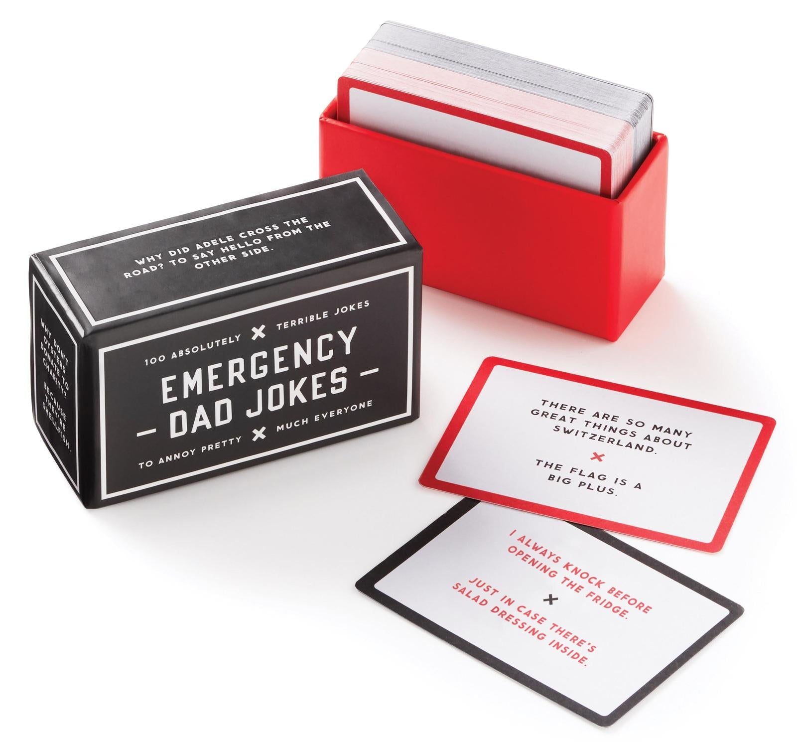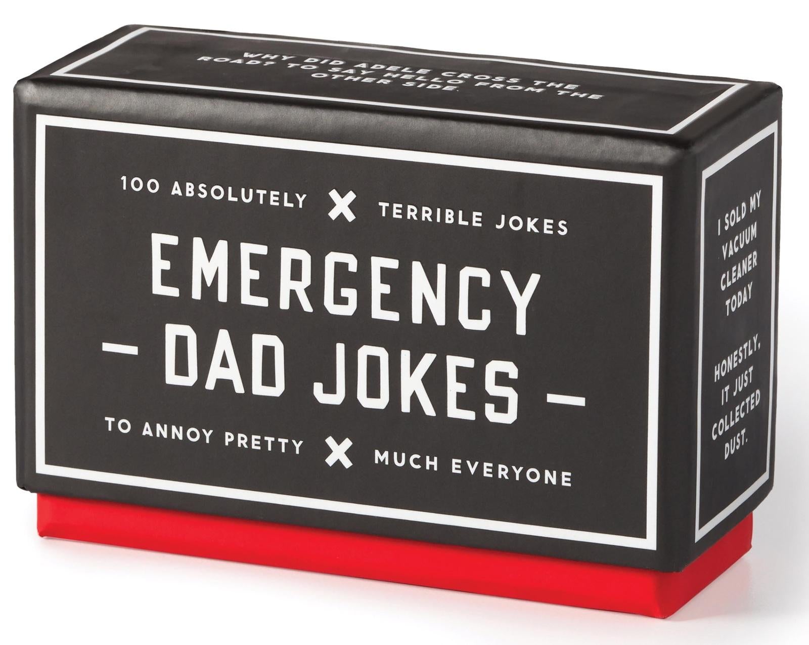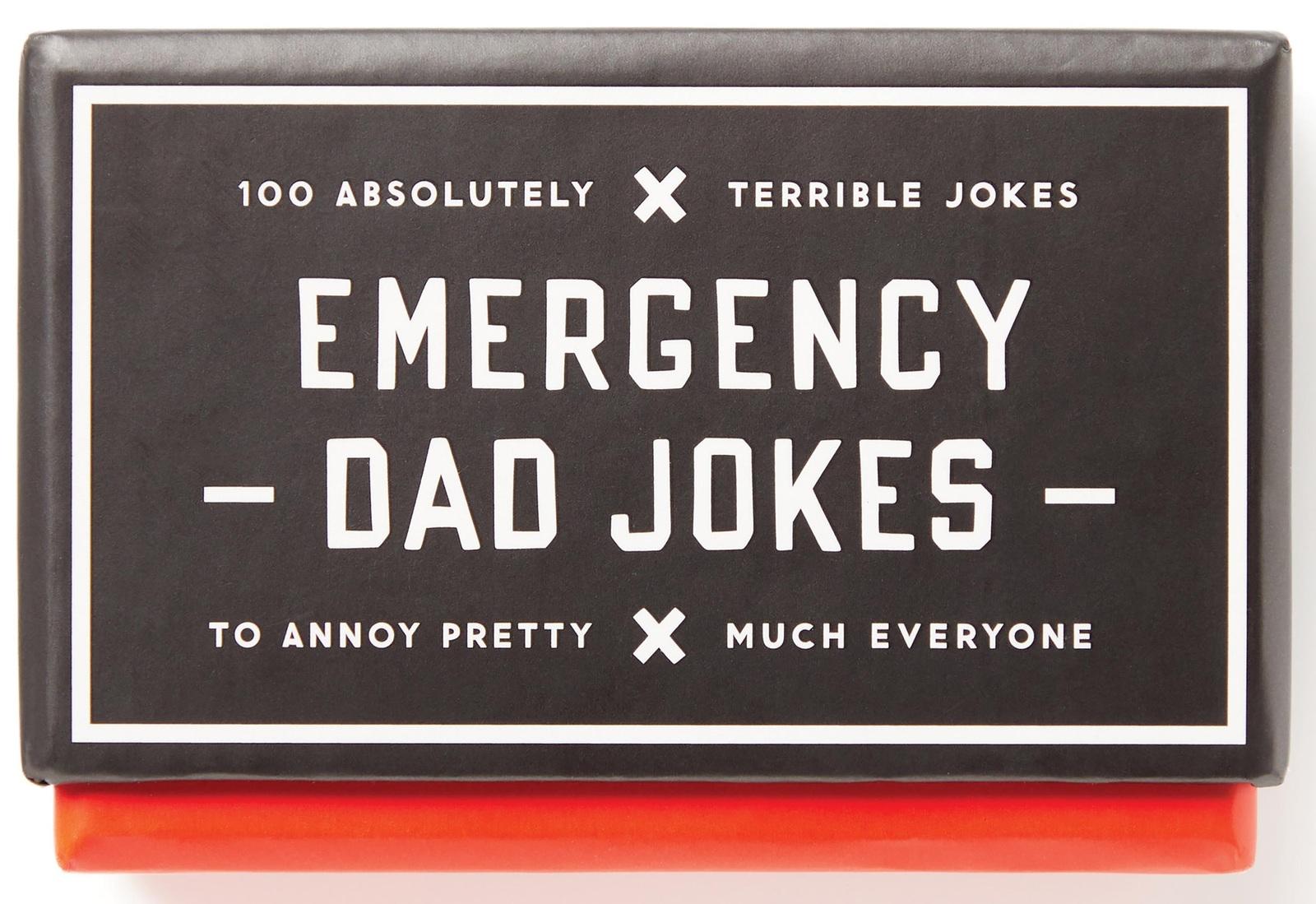 *_Brass Monkey: Emergency Dad Jokes_*Being a dad is hard enough as it is without having to come up with endless groan-worthy one-liners on top of it. Talk about unrealistic expectations. That's why this cargo-short-pocket-sized card deck is packed with a hundred terrible, ready-to-roll jokes–perfect for adding a few exasperated sighs to any occasion.There's even a place on the back of each card to write a heartfelt note–or just 'Hi hungry, I'm Dad.