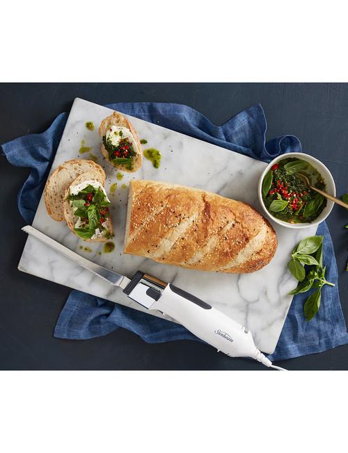 *Sunbeam: Carveasy Twin Blade Electric Knife*Twin blade sets – shorter coarse blades will ensure perfect even slicing for meats, standard breads & small style foods. The longer finer blades are designed for delicate foods, cakes, artisan bread and soft fruits & vegetables.*Features:** Double serated stainless steel blade sets: Coarse & Fine* Easy wipe* Neon power light* Easy release blade system* Easy access power trigger* Safety guard for blade release* 90 Watts*Size:*Bread blades* Full length tip-to-tip : 305mm* Cutting length : 225mmMeat blades* Full length tip-to-tip : 275mm* Cutting length : 190mm