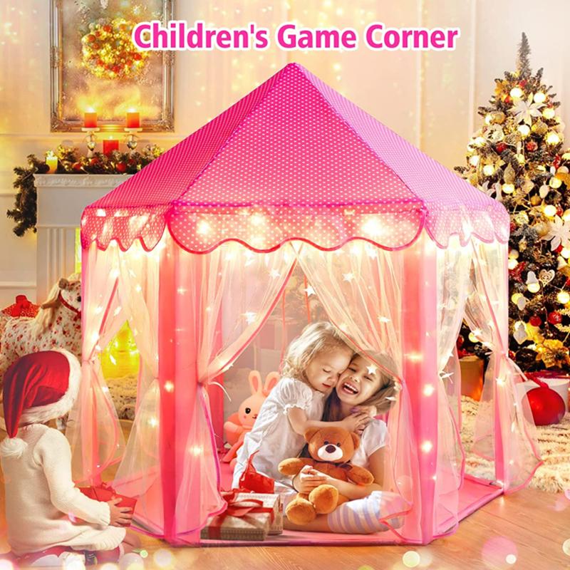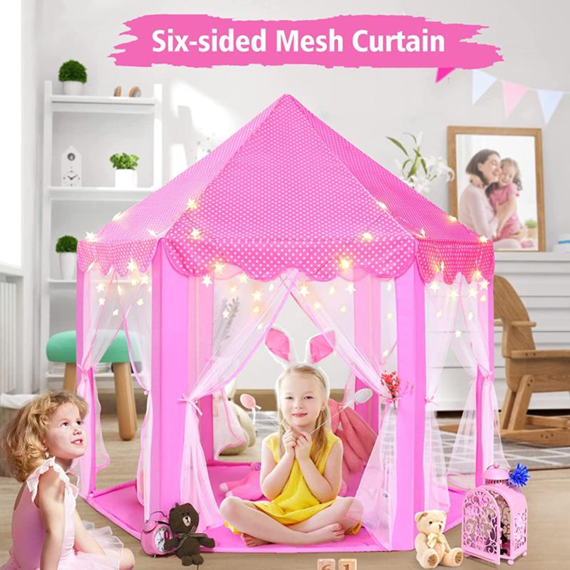 *Princess Tent Girls Large Playhouse Kids Castle Play Tent – Pink*Inspired by castles in fairy tales, this beautiful and extraordinary princess house can help make your little princess dreams come true.This is the cutest fairy house tent that provides your kids with private space to entertain and relax. This tent can accommodate 2–3 children at the same time.It is made of durable and reliable PVC material that can be used for a long time, with a sturdy pole, it can be easily installed without using special tools.Lightweight and portable, the tent is perfect for home, backyard, park, party and more.Tips: We could use LED string lights and ballon to make the castle more beautiful.(string lights and ballon not included)*Specifications:** *Color:* pink* *Material:* PVC, Polyester,* *Size:* 134×134×140cm* *Weight:* 1430 grams* *Package Contents:* * 1 x tent * 1 x Storage bag