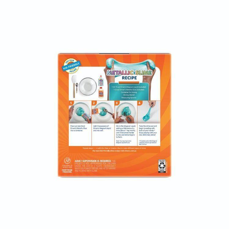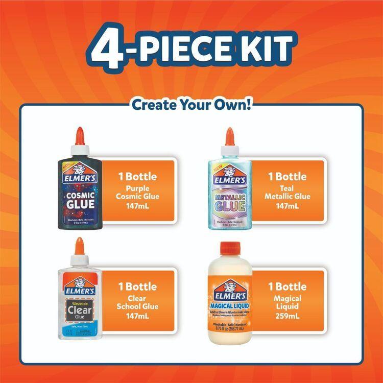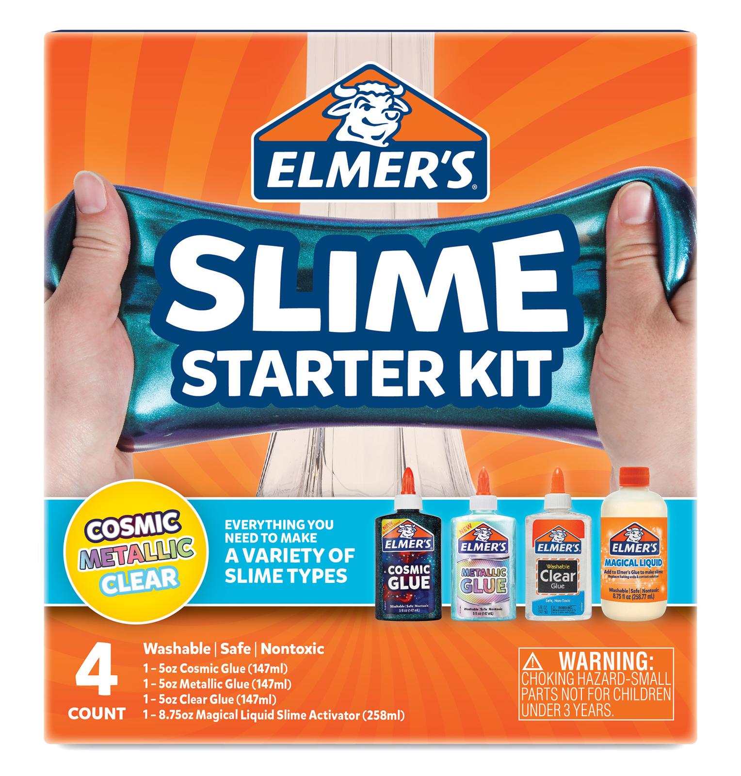 This Elmer's Cosmic Slime Starter Kit is the secret to endless slime making fun. It contains all the ingredients you need to make a variety of different slimes, including Cosmic, Metallic, and Clear.* This kit allows you to make a variety of different slimes, including Cosmic, Metallic, and Clear.* This kit comes with 1 x bottle of Elmer's Magical Liquid Slime Activator (258 mL), 1 x bottle of* Cosmic Glue (147 mL), 1 x bottle of Metallic Glue (147 mL), and 1 x bottle of Clear Glue (147 mL).* The safe formula is perfect for youngsters.* Slime is a great option for sensory play for all ages.* It's safe and non-toxic.