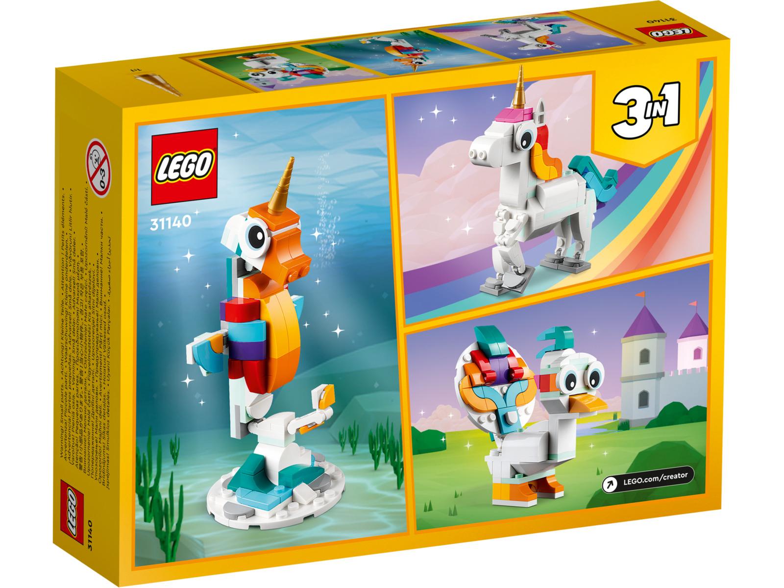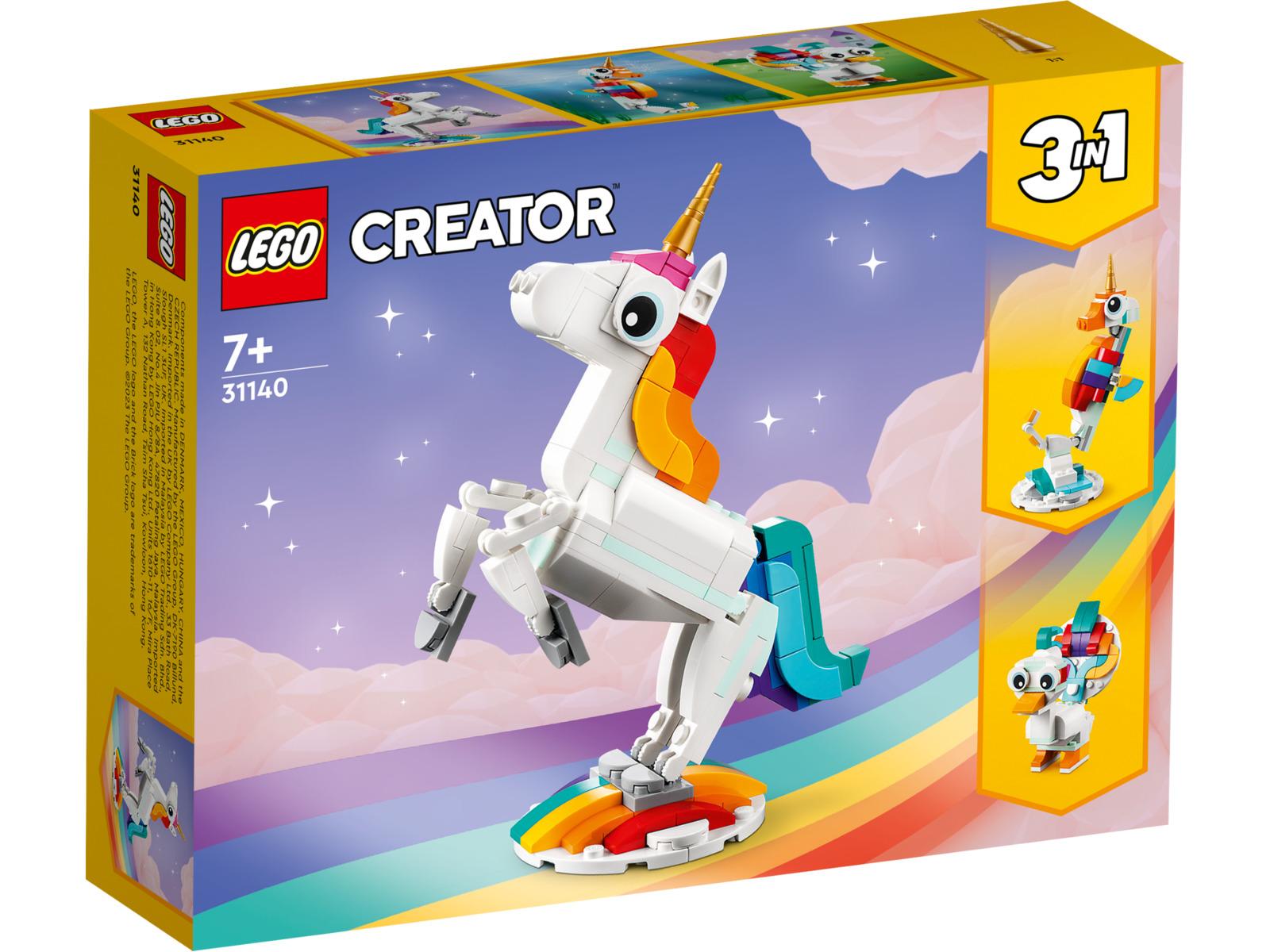 *Kids can enjoy playtime in a mythical land with this beautiful LEGO® Creator 3in1 Magical Unicorn, then rebuild it into a seahorse or a peacock.*Imaginative kids aged 7+ can be transported to a mythical land for enthralling action with this 3in1 Magical Unicorn (31140) building set. It features a unicorn toy with a golden horn, colorful tail, and posable legs and hooves. It can be presented in 2 different positions: standing on 4 legs or reared up on its 2 hind legs for an iconic pose and displayed on the set’s rainbow stand.Build colorful animals from LEGO® bricks The mythical action never stops with 3 different magical creatures for little builders to assemble in this LEGO Creator 3in1 set. They can build a posable Magical Unicorn, rebuild it into a posable seahorse toy with a seabed stand, turn it into a posable magical peacock with a colorful tail, or even use the bricks to create another enchanting creature. LEGO Builder app Download the LEGO Builder app and step into a new world of building fun where kids can zoom in and rotate models in 3D, save sets and track their progress.*Features:** Little builders can build and rebuild 3 different colorful models with this LEGO® Creator 3in1 Magical Unicorn (31140) playset* Kids can enjoy fun stories with 3 different scenes in a mythical land: trot across a rainbow with a Magical Unicorn, swim with a seahorse or play with a peacock* Each of the 3 creatures has posable body parts: the unicorn can move its legs and hooves; the seahorse moves its tail, fins and head; and the peacock has a movable tail and eyes* All 3 of these durable magical animals can be easily displayed: the unicorn on a rainbow stand, the seahorse toy on a seabed stand, and the toy peacock on its 2 legs* This 145-piece playset gives kids aged 7+ an enjoyable building task before the imaginative play begins and can be given as an unexpected treat, birthday present or holiday gift* Standing over 13 cm tall, the Magical Unicorn can be played with at home by kids or popped in a bag and taken with them on their travels* Discover intuitive building instructions in the LEGO® Builder app where kids can zoom in and rotate models in 3D, track progress and save sets as they develop new skills*Specifics:**Item:* 31140*Pieces:* 145*Ages:* 7+