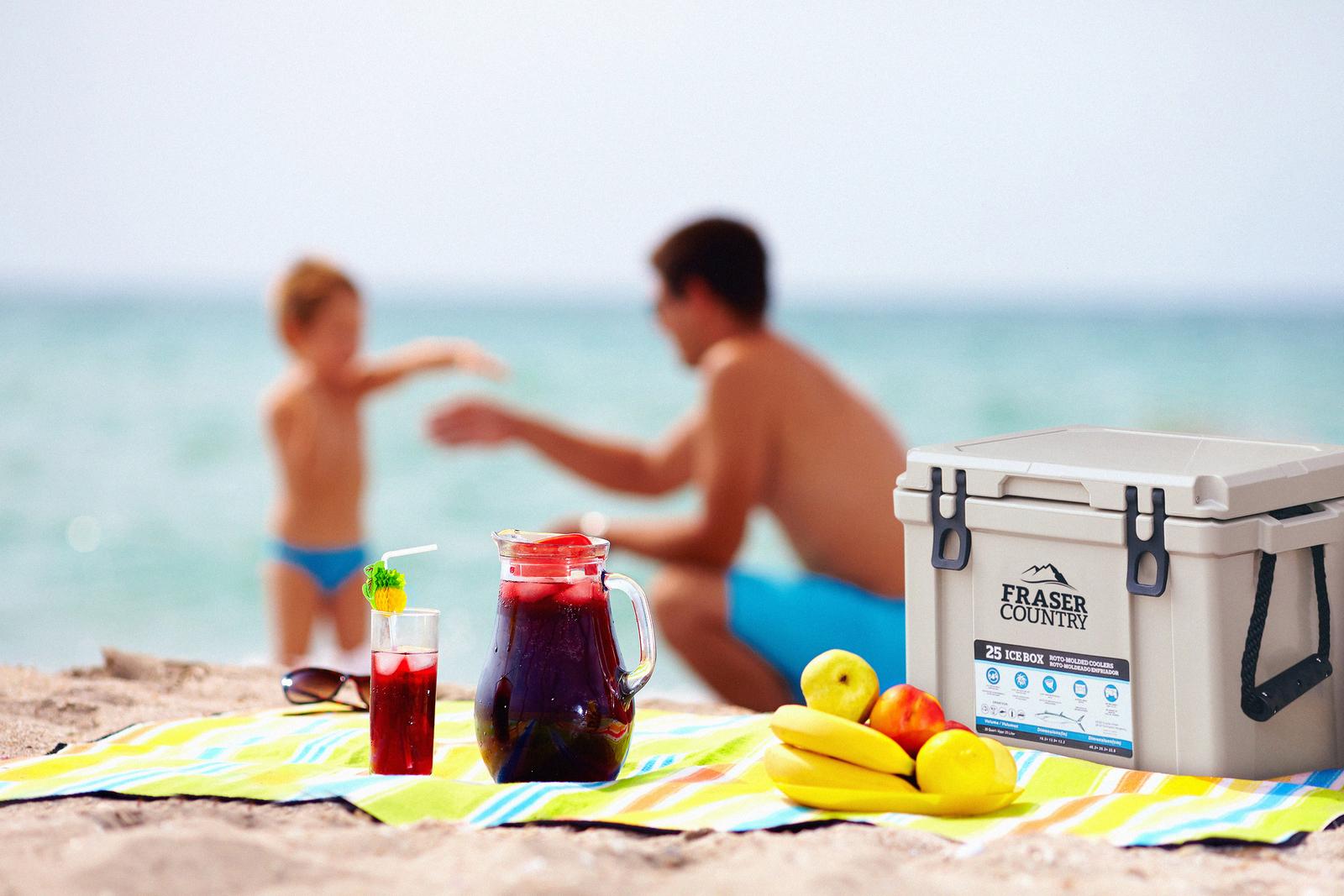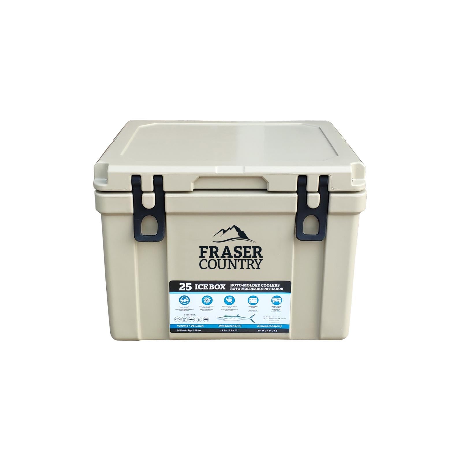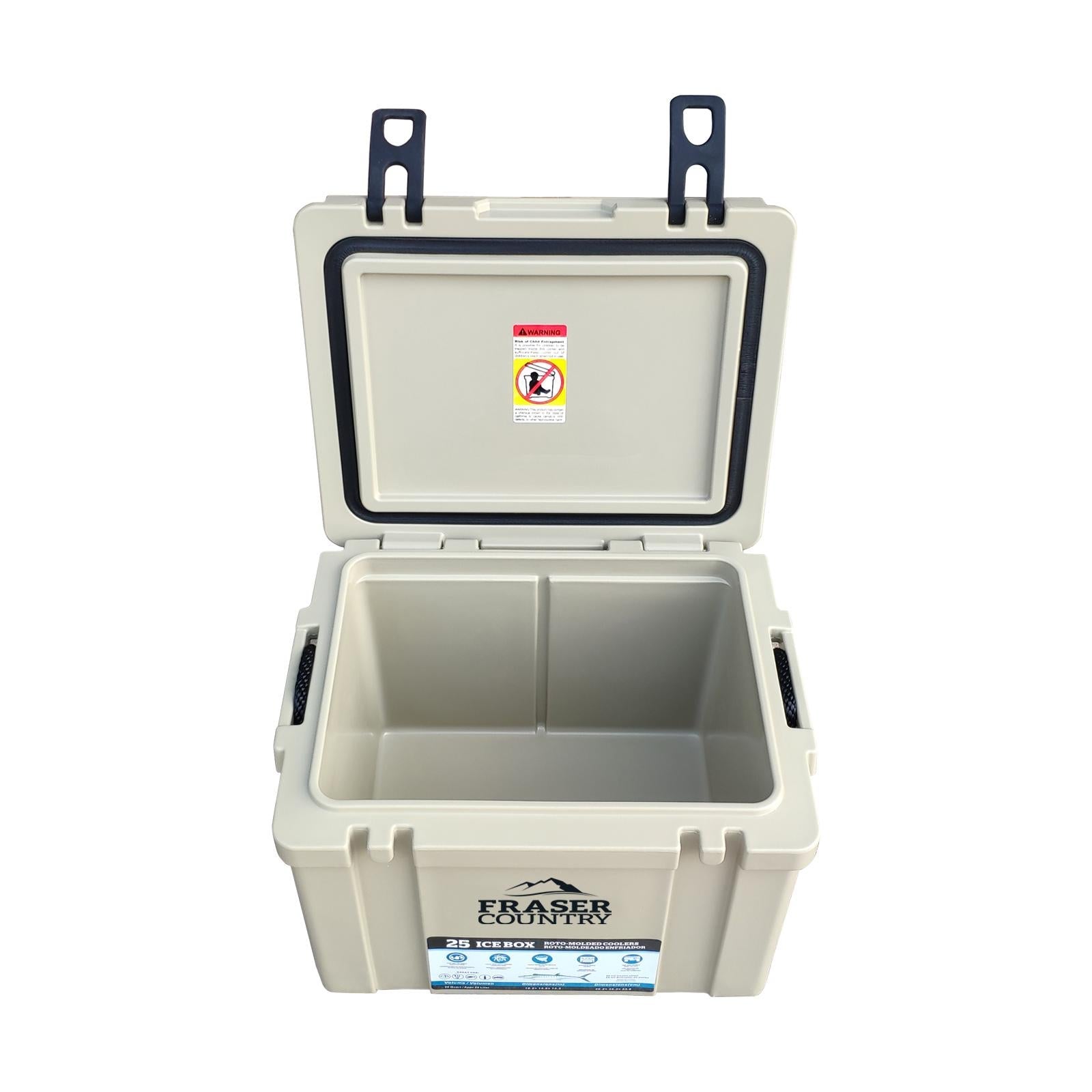 *Fraser Country Heavy Duty Ice Box Chilly Bin 25 Litres*The Fraser Country roto-molded chilly bin is the perfect combination of quality, durability and performance to keep your food chilled and safe. It can hold large quantities of ice and frozen goods for days and is ideal for family picnics, BBQ, parties, camping and boating. Wire baskets and divider are included to make compartments and maximize your storage area.*Features:** Heavy-duty roto-molded construction for durable outdoor use* Thick and insulated design wall offers ice retention up to 3 days for maximum cooling* EVA Seal provides an airtight seal to keep contents cold and is removable for easy cleanup* Hinge – Designed to create a strong hold between lid and body of chilly bin.* Anti-skid feet for smooth travel* Materials are non-toxic, tasteless and approved for direct contact with food* Drain Valve design with recessed drain plug, which makes the melted ice flow out easily.* Built-in UV resistance helps prevent plastic breakdown and fading caused by sun exposure* Motion Sensor LED Cooler Light can be fitted as an optional accessory (Not included)*Specifications:** *Material:* LLDPE (Linear Low Density Polyethylene) and Commercial Grade PU (Polyurethane) foam* *Capacity:* 25 Liters (Could fit estimated 30 cans of drink)* *Outer size:* 46.3×35.2×33.6 cm* *Inner size:* 36.5×25.4×27.0 cm* *Wall thickness:* 3 cm* *Lid thickness:* 3.2 cm* *Lid seal:* EVA(Ethylene-vinyl Acetate)* *Lid lock:* Silicon* *Cold storage time:* Up to 3 Days* *Product weight (Approx.):* 7.8 Kg* *Colour:* Beige* *Accessories:* 2 wire baskets and a PP divider are included*Note:** *[Motion Sensor LED Cooler Light](https://www.mightyape.co.nz/product/motion-sensor-led-light/32113680)* is not included, need to order separately.* Decorative items in above images are not included.