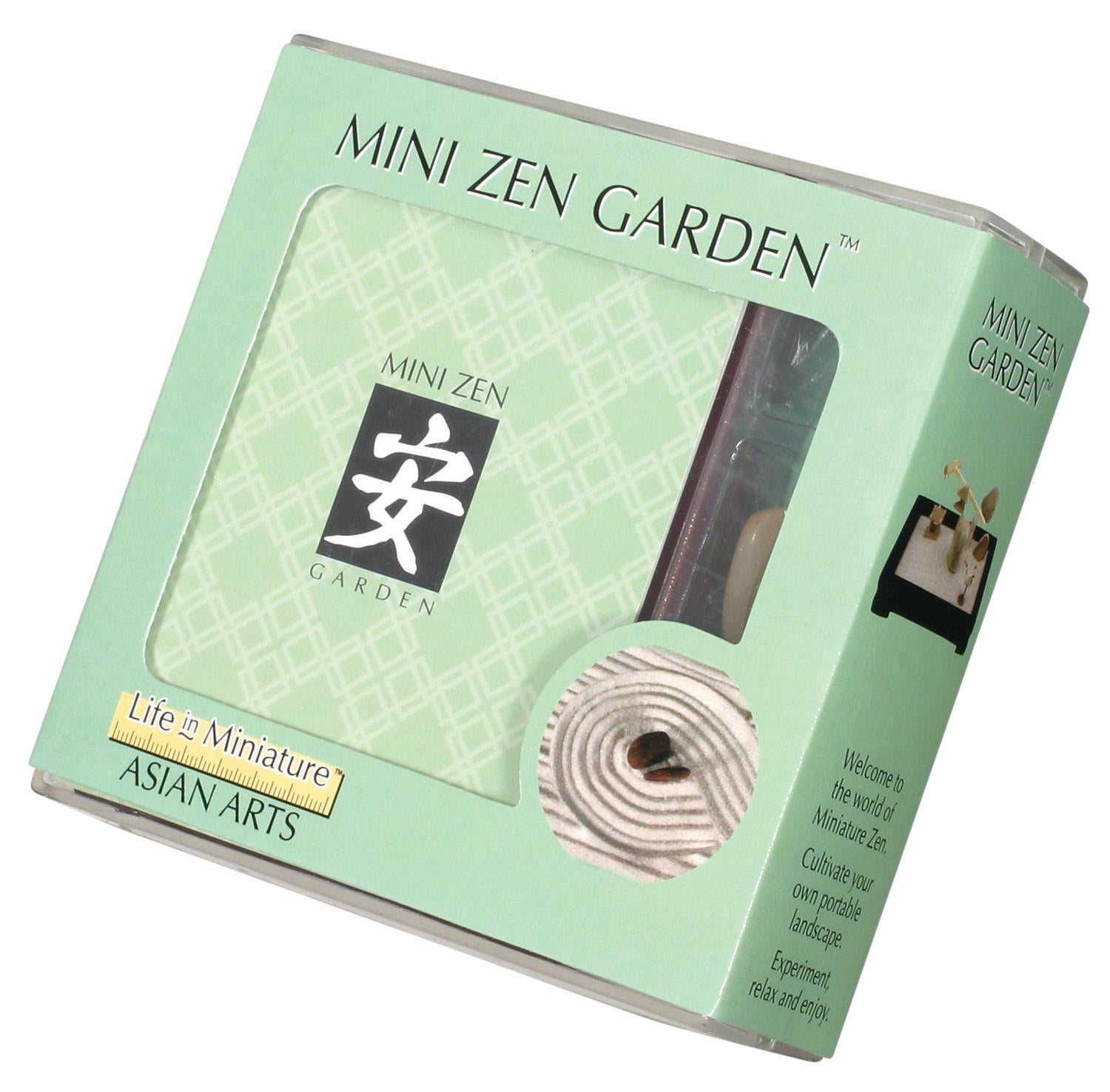 This tiny Japanese Rock Garden is perfect for small spaces and desktops.The Garden measures *10 cm by 7.5 cm*, and includes white sand (representing the ocean), river stones (representing islands), three ceramic decorations, a wooden rake and mini zen guide for making the garden your own creation._Please note:_ The Garden comes in assorted black and rosewood finishes, unfortunately we cannot guarantee which variety will be provided.
