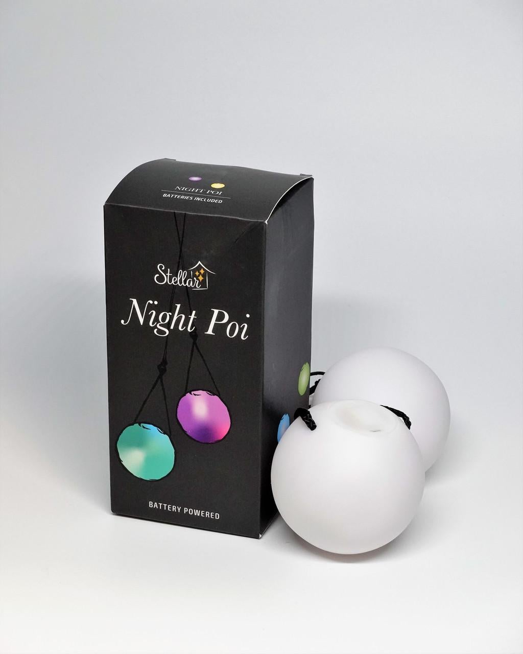 *_Stellar Haus: Night Poi Set_*Ka mihi tēnei ki ngā pūmanawa tuatahi o te toi poi, arā ko te iwi Māori o Aotearoa.We acknowledge the indigenous origins of poi, the tīpuna creators and pioneers of toi Māori and all efforts to honour and retain the ways of those who lit the trail ahead of us.*Product details** Set includes two mid/long LED poi with handles, straps and carry bag* Adjustable handles/string 30–55cm with reinforced finger grips* Replaceable LR44 batteries included* Poi is 8cm diameter* Made from soft PVC* On/off switch* 6 Modes: single colour, cycles and strobe* Indoor or outdoor use* Suitable for beginners, but padding in sensitive areas recommended* Small parts not suitable for under 3 years old (supervise children!)* Packaged in a stunning full print black card retail box*Poi history*The kupu (word) poi means both sphere (n), and to toss (v) and the kupu is now synonymous worldwide with poi performance.The art of poi has long been practiced by Māori, the indigenous people of Aotearoa, New Zealand and there is research indicating the use of poi in our early Polynesian neighbours’ communities.Traditional use was likely to develop coordination, strength and dexterity, but I’m sure the captivating playfulness included games, and that led the transition to the stage.Now the poi is a component of most kapahaka competition sets and a favourite for many performers and observers alike.Poi performance has also increased in pop and sub cultures worldwide, and it is perhaps regrettable that the cultural aspects haven’t travelled with it.