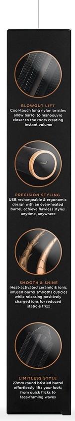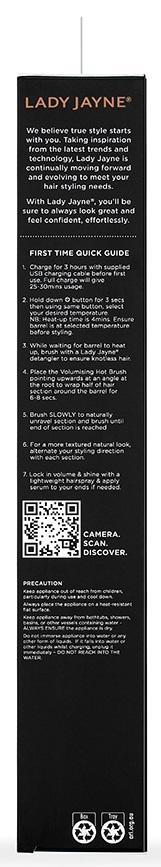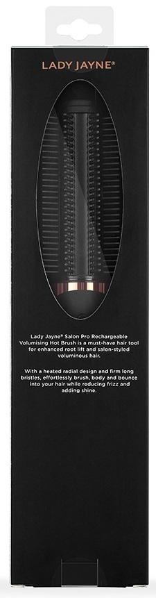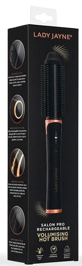 *_Lady Jayne: Pro Rechargeable Volumising Brush_*Effortlessly add volume and lift with the Lady Jayne Salon Pro Rechargeable Volumising Hot Brush. A 27mm ceramic-ionic infused heated radial bristle brush.*Features:** 80% increase in volume\** USB Rechargeable – charge anywhere* 25mins cordless styling time – use anytime* Ceramic-ionic infused 27mm barrel – for smooth shiny hair* Even-heated barrel – for ease of achieving limitless looks* Internal lithium battery – for fast charging (2.5 hours)* 3× Heat settings – ideal for most hair types*How to Use:*1\. Charge for 2.5–3 hours (2V) with supplied charging cable before first use. The LED red light will turn blue when fully charged.Note: The Volumising Hot Brush cannot be used while charging. When the battery is low the red LED lights will sequentially flash to make you aware the battery is low. Depending on the temperature selection, your remaining usage time will be between 2–6 mins.2\. Ensure hair is clean, dry and knotless with a Lady Jayne detangling brush before styling.3\. Turn Volumising Hot Brush on, by pressing the Power / Temperature Button ( ‘D’ ) for 3 seconds.4\. Use the same button to select the temperature best suited for your hair.5\. Section hair between 4–5cm in width and clip to allow for easy styling.6\. Begin with front sections working your way to the back sections by moderately stretching each section with your free hand while using your dominant hand to place the Volumising Hot Brush pointing upwards at an angle at the root to wrap half of hair section around the barrel for 6–8 secs.7\. Brush SLOWLY to naturally unravel section and brush until end of section is reached.8\. To create lift at the crown, place the Volumising Hot Brush at the root horizontally and wrap hair around the barrel and hold for 6–8 secs then unwind.9\. For a more textured natural look, alternate your styling direction with each section.10\. After use, turn your Volumising Hot Brush off by pressing the Power button.11\. After every brush, for next-use convenience, insert charging cable. Once LED lights have turned white remove charging cord.12\. Allow Volumising Hot Brush to cool before storing in velvet pouch provided.