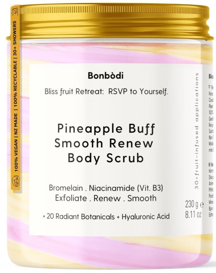 *_BonBodi: Pineapple Buff Smooth Renew Body Scrub (230g)_*Dive into a luminous escape with our Pineapple Buff Smooth Renew Body Scrub. Bromelain-rich Pineapple and sugar crystals, buffs and polishes, revealing the fresh, glowy skin beneath.Boosted with Niacinamide (Vitamin B3), and hydrating Hyaluronic Acid, and 20 glowy botanicals.*Features:** *Pineapple Extract:* Rich in bromelain enzymes, perfect for gentle exfoliation.* *Niacinamide (Vitamin B3):* Enhances skin's texture and tone.* *Certified & Cruelty-Free:* Committed to ethical, vegan, and plant-based skincare solutions.* *Gentle & Effective:* Specially designed to be kind to every skin type, ensuring a rejuvenating exfoliation experience.* *Eco-Friendly & Safe:* Sustainable and non-toxic ingredients packed in recyclable jars, crafted with care in small batches.* *Made with Love in New Zealand:* Ensuring premium quality and attention to detail in every product.*How to Use:*Gently massage a small amount in circular motions onto wet skin, focusing on rough patches. Rinse off to reveal a renewed, glowing you.*Yes list:** Peta Certified* Cruelty-Free* Plant Based 100% Vegan* Gentle on Skin* Recyclable* Sustainable* Non Toxic* Made by us in mini batches