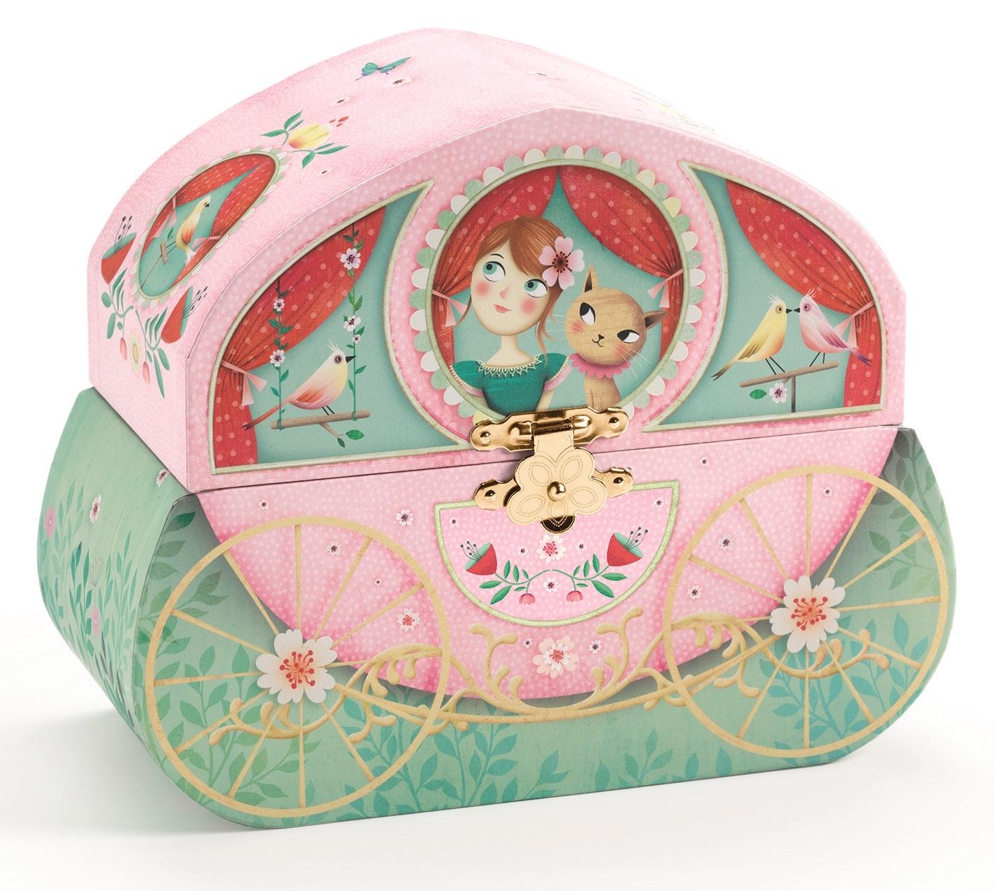 *Djeco: Musical Treasure Box – Carriage Ride*Everyone needs a place to keep their treasures, keepsakes and special stuff. This DJECO Treasure Box is a special gift and a wonderful dresser top decoration. Turn the handle on the back of the box and special, classic song plays. Each box has a special spinning figurine, mirror back drop, velvet lined compartments and a pull-out drawer.*Features:** Your little ones can keep their treasures safe & secure* Turn the handle and open the top and it plays “Let Me Call You Sweetheart”* Elegant carriage shaped music box with princess and cat characters.* Made form the highest quality wood, plastic and metal* Line with soft luxurious velvet*Suitable for ages 4 & up*