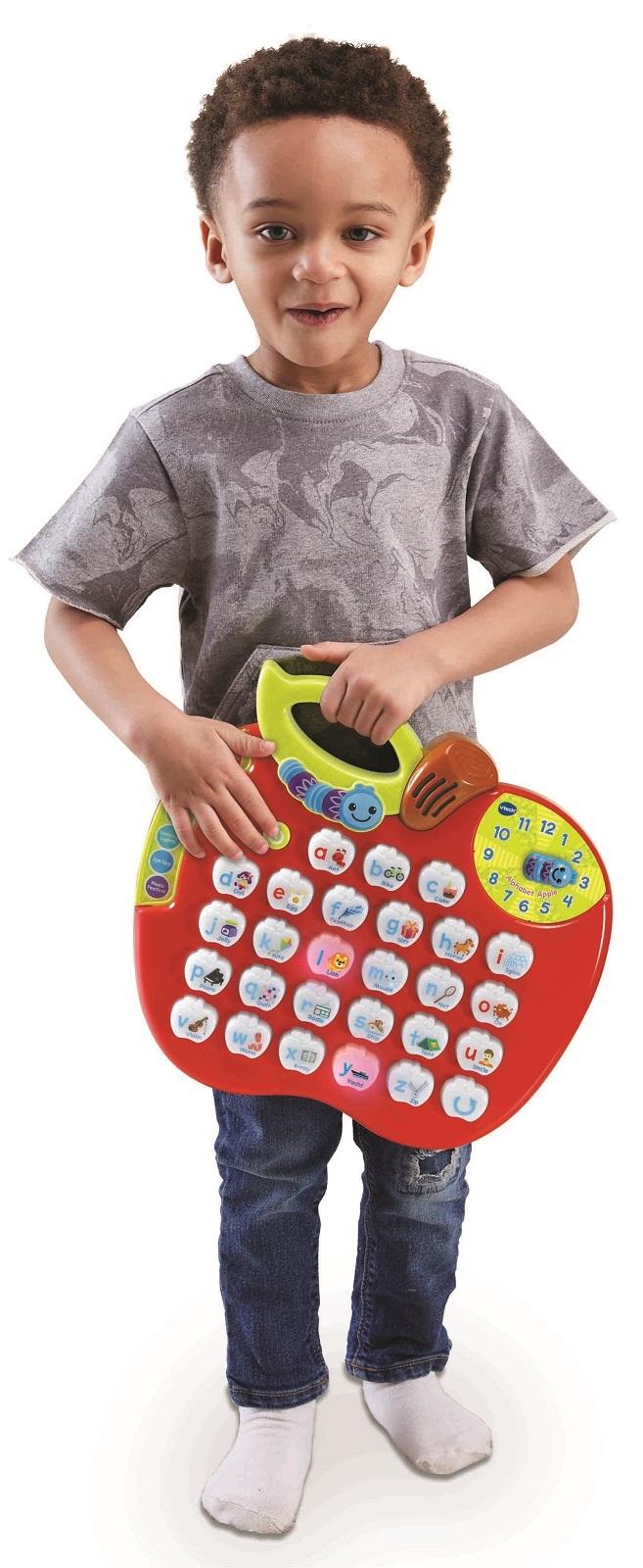 *Pick up the Alphabet Apple by VTech for an apple a day of learning and play!*Twenty-six easy-to-press letter buttons on this interactive learning toy teach the alphabet sequence, phonics sounds, letter names and spelling, and play melodies and sound effects. Keep children interested and challenged with progressive learning levels. Start in Phonics World to hear letter sounds, then switch to Discovery Time to learn about words and letter order. Follow the light-up buttons to practice spelling with the Spelling Game. Move the worm clock hand around the play clock to explore time concepts, then switch to Feed the Hungry Worm to practice counting.*Features:** Ready to practice memory skills?* Turn on the Dancing Lights game and try to repeat the light-up patterns on the apple.* Go to Music Festival when you’re ready to get up and dance!* Find out what you’ve learned by quizzing yourself in Eye Spy.* This educational apple helps preschoolers get ready for school.* Bring this portable toy anywhere for bushels of fun and learning on the go!_Requires 3 AA batteries; batteries included for demo purposes only; new batteries recommended for regular use_*_Intended for ages 3–6 years._*